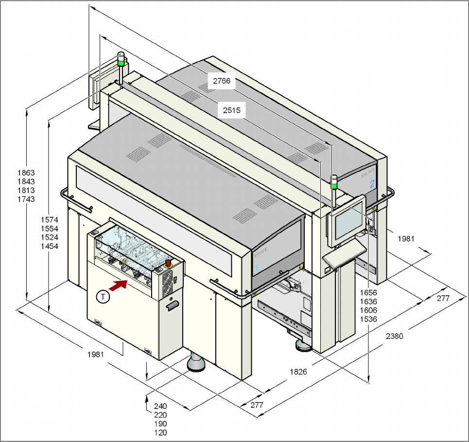 Üzemeltetési útmutató SIPLACE X-sorozat Az automata m ű szaki adatai Az SR.70x.xx szoftververziótól Kiadás 01/2011 Méretek és súly 113 3.3.3 A felhajtott véd ő burkolat magassága 3 3 3 3 3.3 - 5 ábra A felhajtott véd ő b…