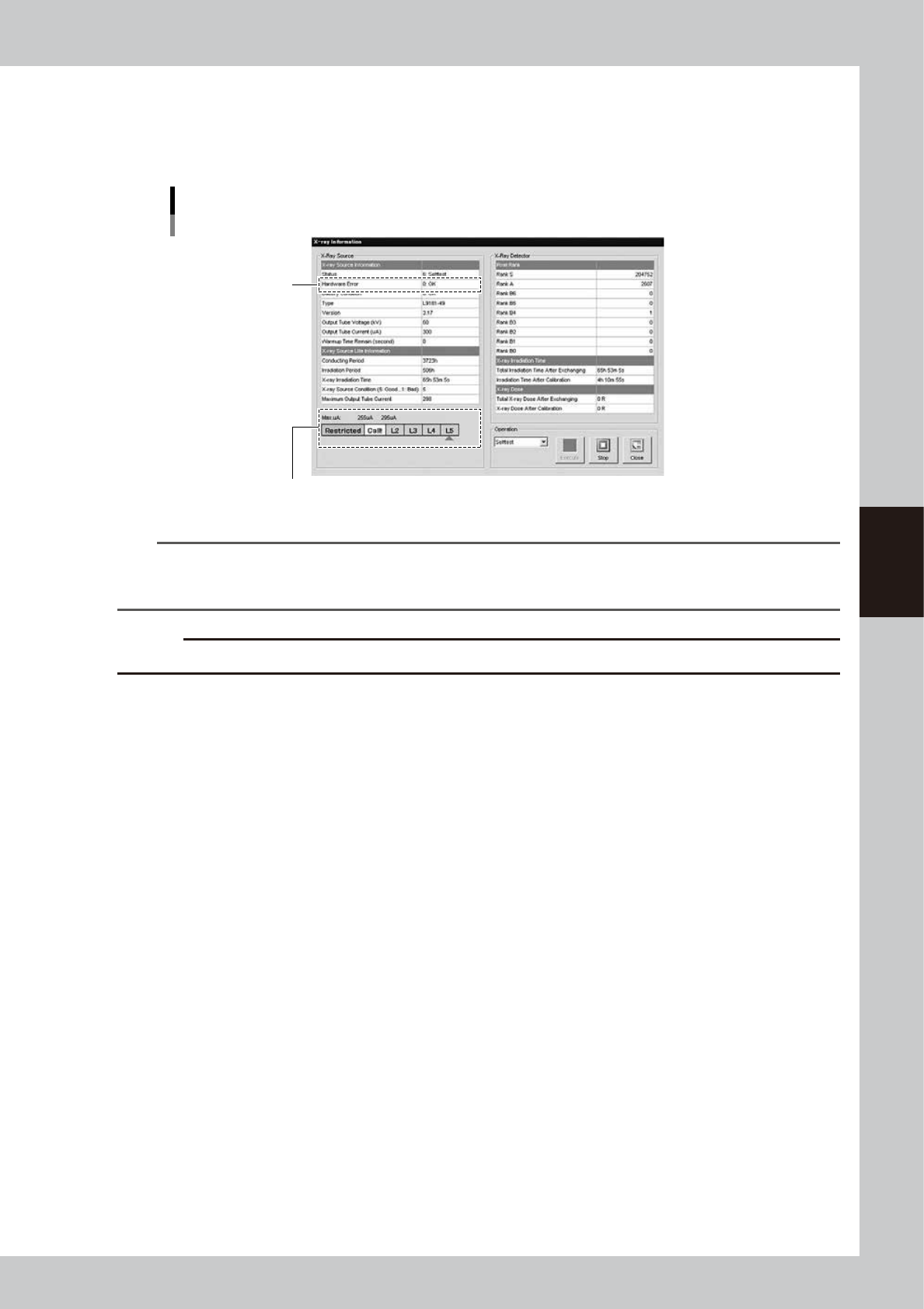 4-27 4 Maintenance 3 Check the self-test results. When self-test is complete, the message “X-RA Y READY” reappears at the right end of th e status area. Check the “Max uA” level shown on the “X-ray Information” screen. I…