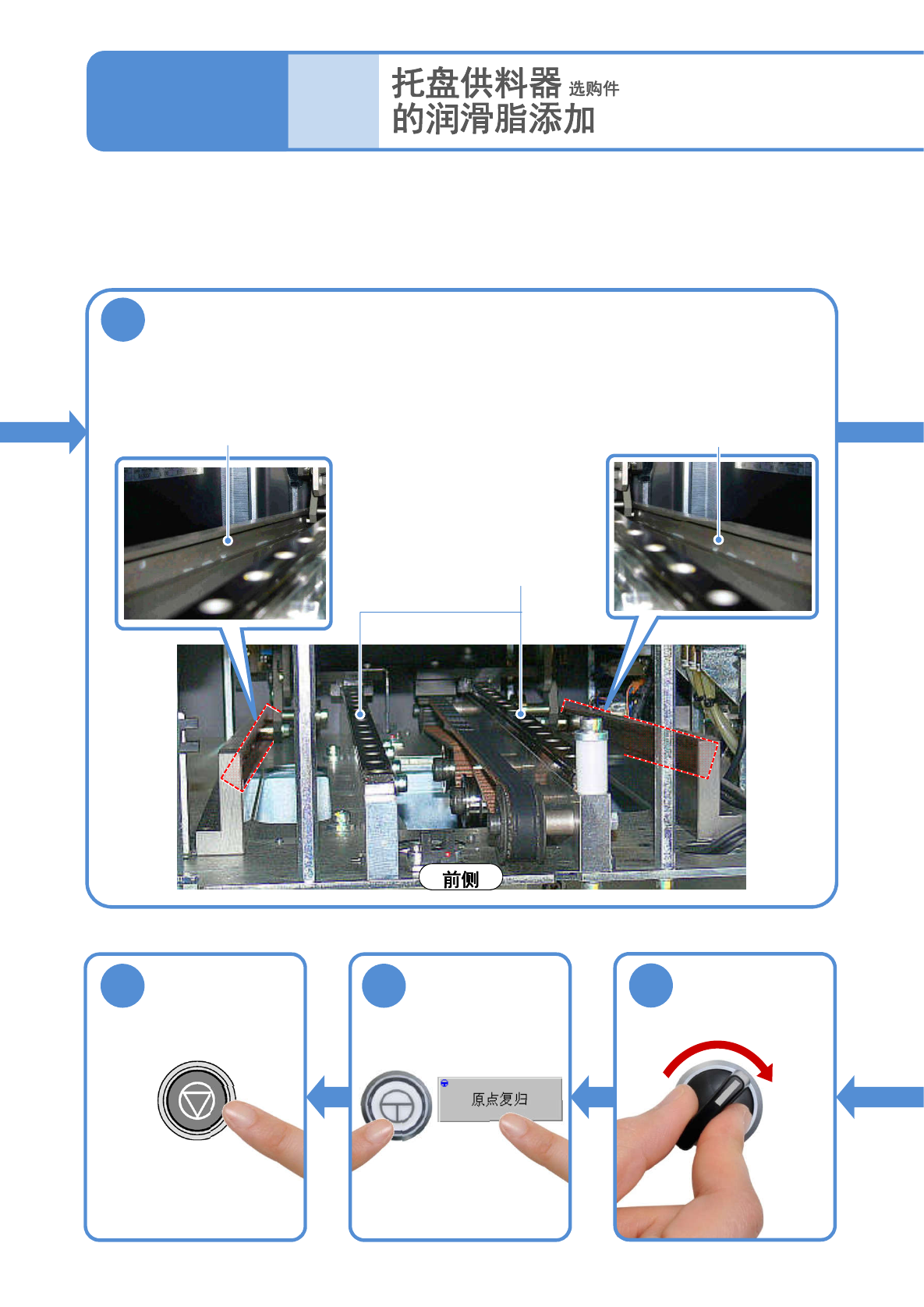 NPM-W2 EJM7DC-MB-06M-00 ( ) 2 6-13 -3 1 2 在托盘供料器拉出部的各部位添加润滑脂 ●双式托盘时, A/B 线性导轨 ( 左右 ) 凸轮块 ( 左 ) 的内侧 ●添加部位 ・ 线性导轨的轨道 ( 左右 ) ・ 凸轮块内侧 ( 左右 ) ●使用润滑脂 :LCG100 凸轮块 ( 右 ) 的内侧 1 8 ENABLING 1 9 约动作1分钟后 维修保养篇 6 - 1 3 SERVO ON 1 7