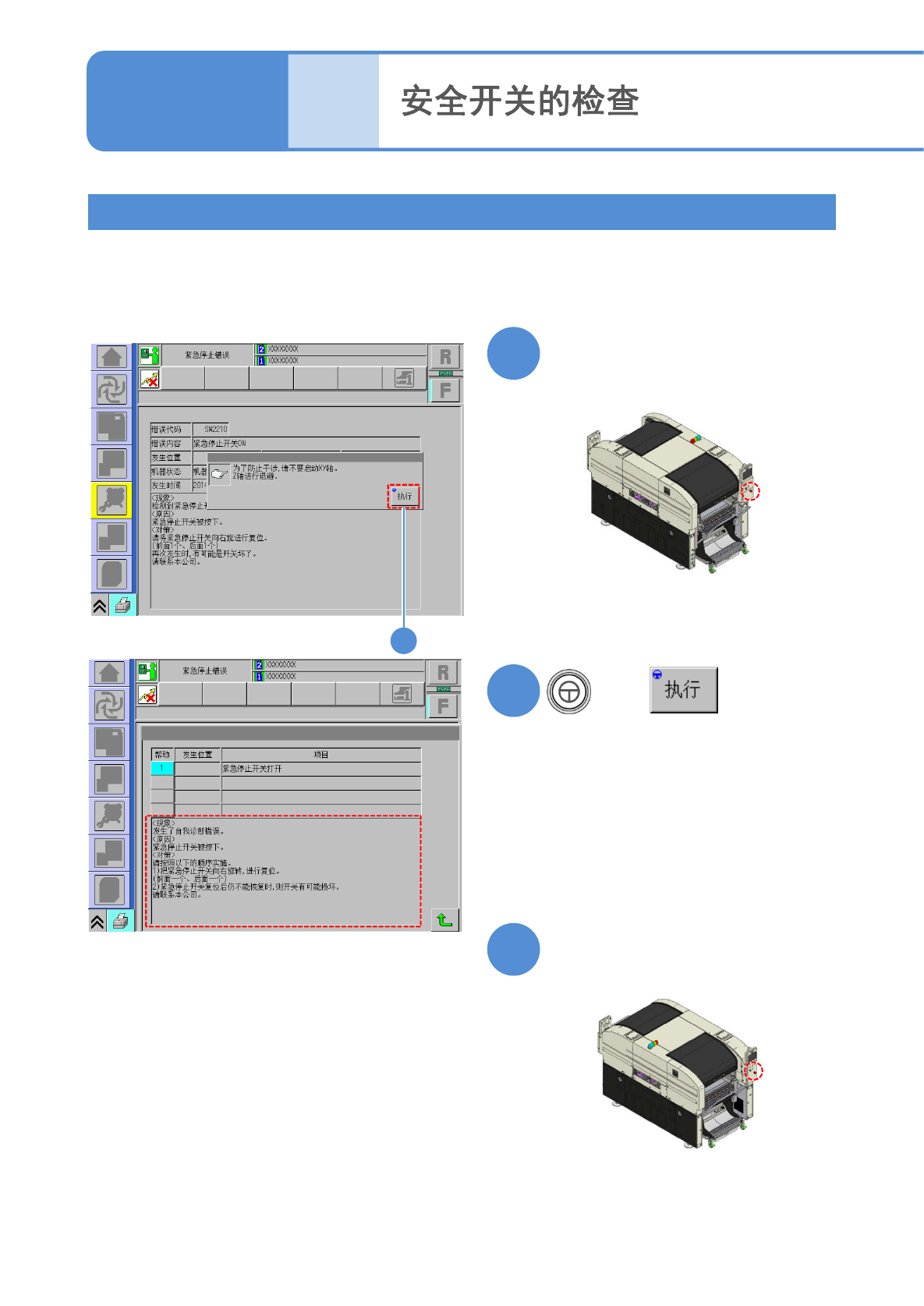 NPM-W2 EJM7DC-MB-06M-00 6-8 -2 定 期 检 查 每 5 6 0 小 时 保 养 对安全开关 ( 安全盖 ) 的检查方法进行说明。 使用工具 : 不要 所需时间 :2 分钟 ●顺序 至 ,是从设备前侧进行,顺序 是从设备的后侧进行操作。 1 2 3 ( 显示「输入确认」画面显示 ) 3 按一次 键 打开前侧安全盖后,确认 ・ [ 安全盖 1] ・ [ 安全盖 3] 的显示颜色是否从蓝色变成灰色 4 打开后侧安…