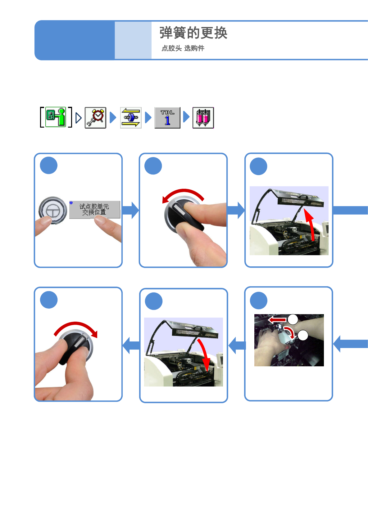NPM-W2 EJM7DC-MB-10M-00 4 卸下试点胶单元 5 卸下止动销 6 拧松压住弹簧的螺 栓 10-3 -5 7 更换弹簧 8 拧紧压住弹簧的螺 栓 9 安装止动销 弹簧 每 1 8 0 0 0 小 时 保 养 定 期 检 查 1 2 ①向左扳倒安装杆。 ②卸下试点胶单元。