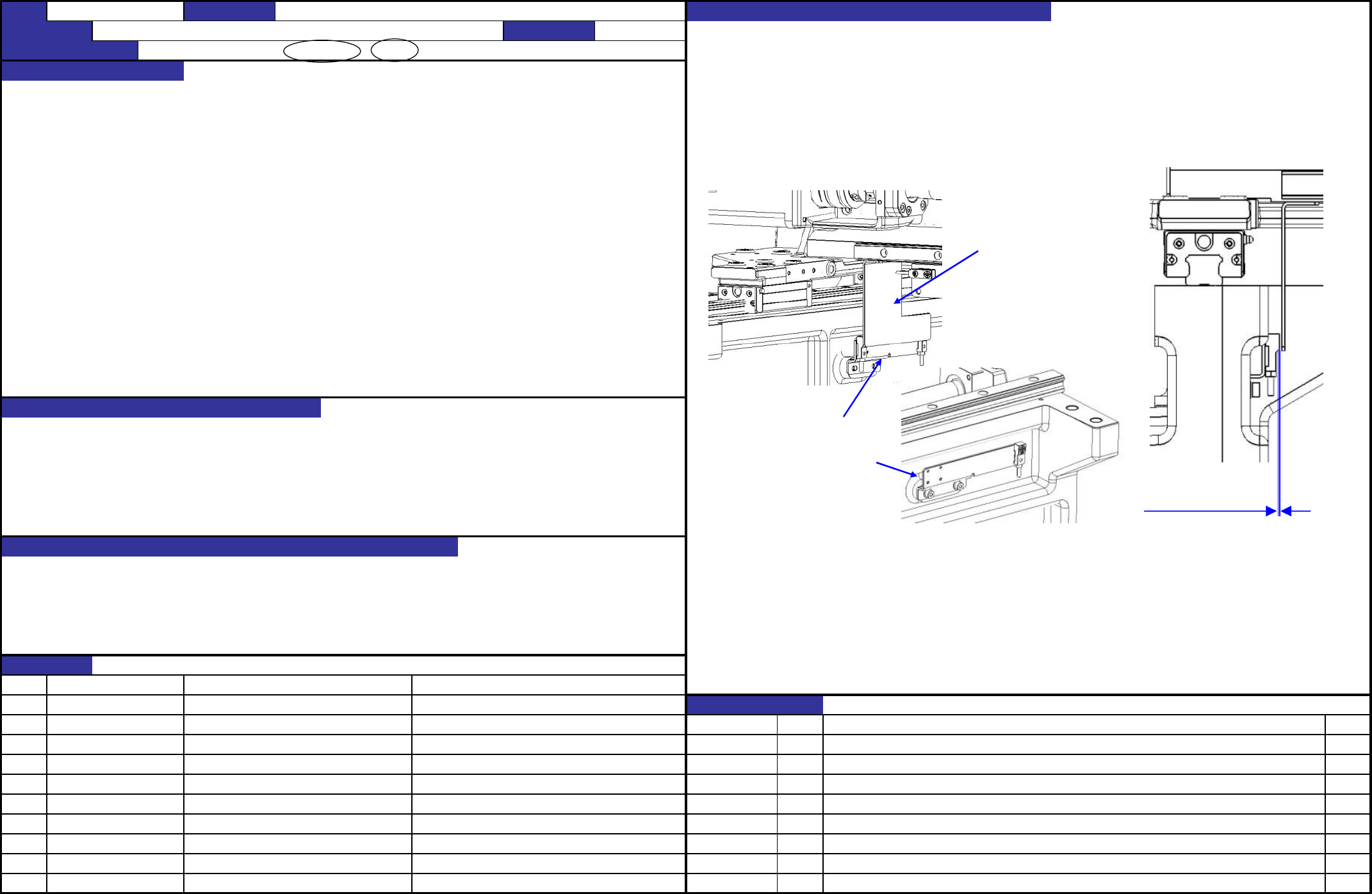 QA表 机种 确认方法 1. 测量各传感器(左1处,右1 处)与X-LMT 传感器碰块的距离,确认在0.8~ 1.5mm的范围内。 调整方法 各传感器与X传感器碰块的距离在0.8~1.5mm 的范围内(目标1mm) 1. 进行调整,使 X-LMT 传感器碰块与传感器表面的距离 为0.8~1.5mm(目标1mm)。 原点及极限位置的检测 1. 原点复归不良 2. Y轴失控时伺服不断开,因超負荷而导致损坏 NO ① ② NO. 担当人 ③ …
