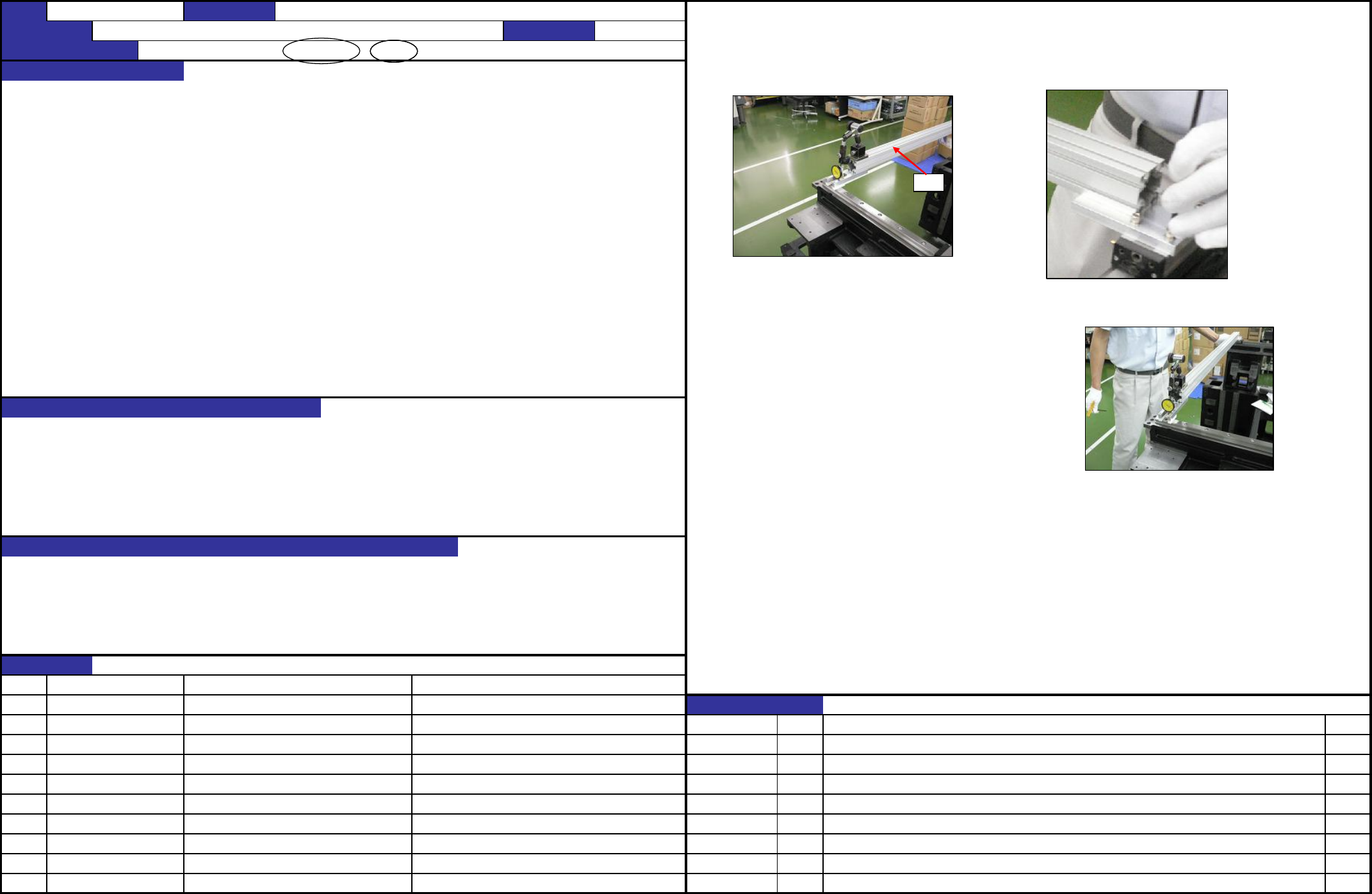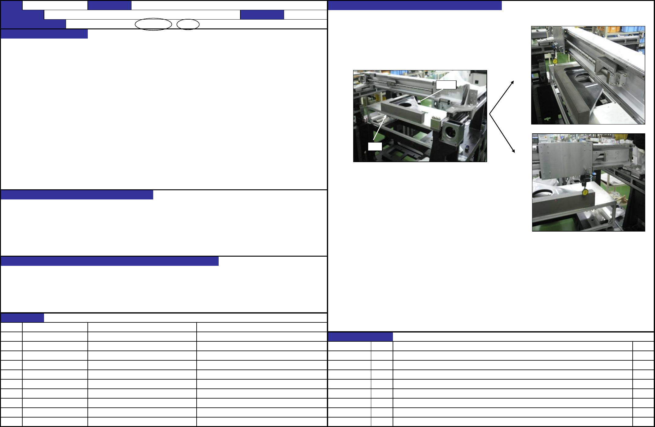 QA表 机种 确认方法 1.确认从石定盤(治具底面)至X_LM导块上面切削部分的高度是否已是 208±0.05mm。 在装配治具上,从框架头安装面至X_LM 导块上面之切削面的高度为 163mm 调整方法 1.将高度规对齐 JIG_MASTER 的上面切削部分,取208± 0.05mm的值。 贴装精度的直角偏斜 *基准位置在反侧也相同 1.贴装精度的直角偏斜 2.从LM导轨发出异音及LM导轨损坏 3.贴装精度恶化,吸附率降低 NO ① …