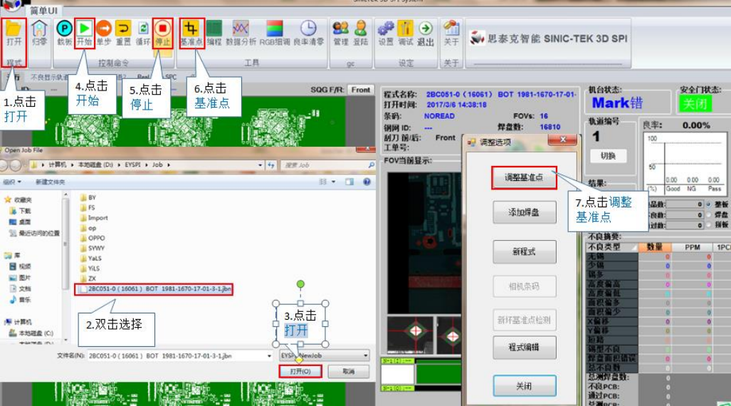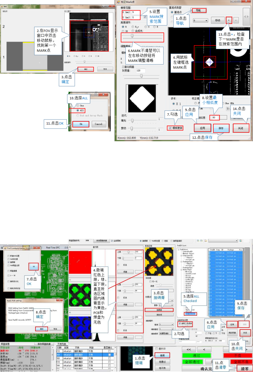 20. 点击 打开 图标, 调用 SPI 参数设置软件输出的 jbn 文件, 待程序加载完后, 放 入 PCB , 点击 开始 图标, 待机台状态显示 Mark 错后, 点击 停止 图标, 再点击 基 准点 图标,在弹出菜单点击 调整基准点 21. 点击 导航 , 在 FOV 显示窗口中双击鼠标移动位置, 直到找到设置的找到第一 个 MARK 点, 点击 确定 退出, 用鼠标左键框选住 MARK 点( 鼠标拉的 框选框必 须比 MARK…