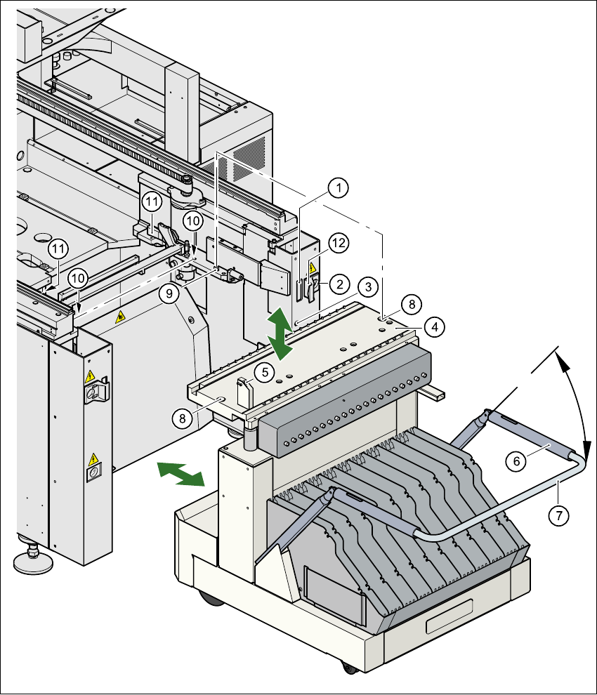 nach den Bügel (Pos. 7) des BE-Wagens nach unten, um die BE-Wagen-Tischplatte absenken