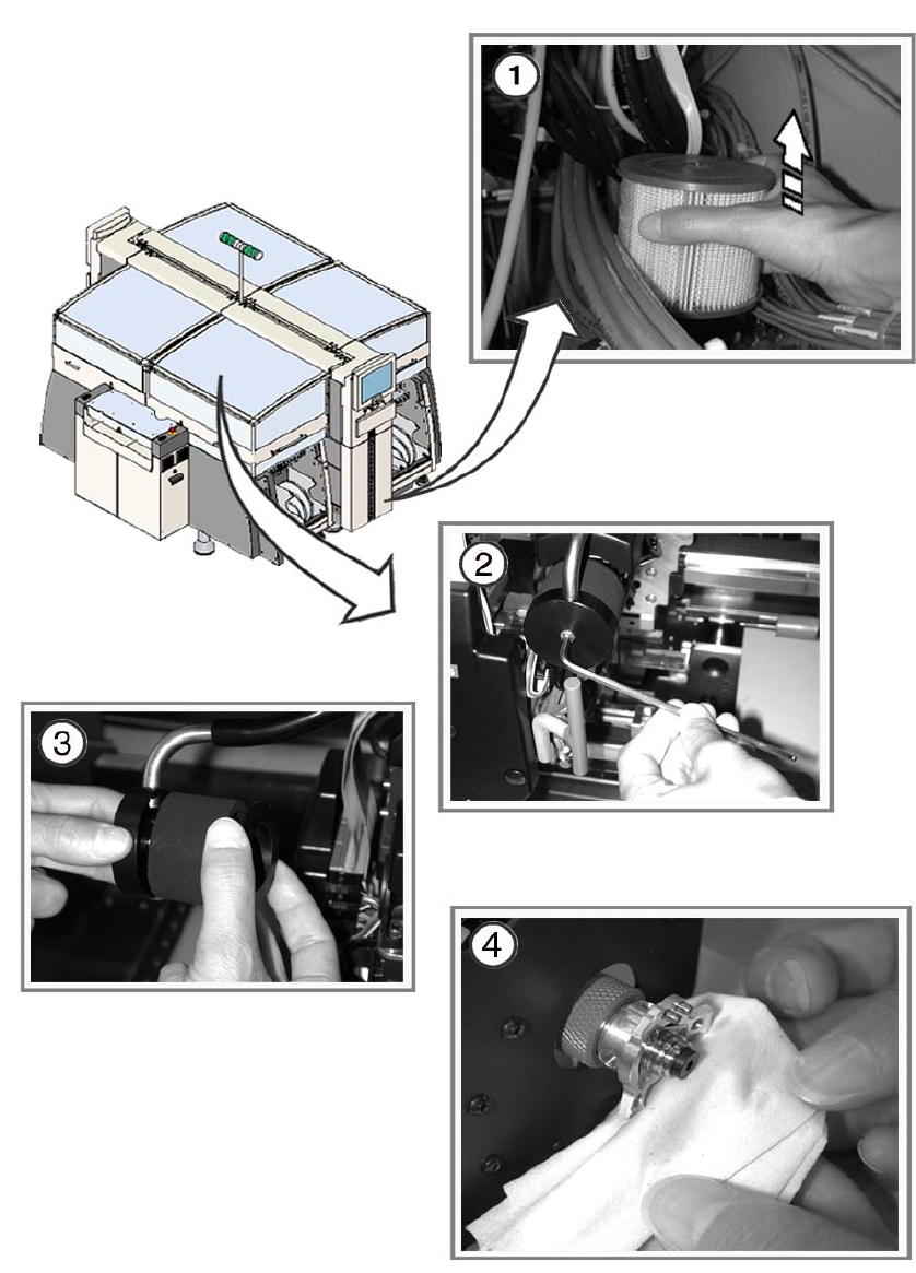 预防性维护 HF 系列 维护 2004 年 3 月中文版 8 2 个月维护 39 检查和 / 更换进气过滤器 8 a 拧下进气过滤器上的翼形螺钉, 卸下过滤器。 : 如果很脏,就更换过滤器 。 8 : 小心地将压缩空气供给装 置推回贴片机内。 8 小心,不要挤压任何电缆或软管 。 8 8 8 : 关闭压缩空气供给的盖板 阀。 : 然后再次打开压缩空气主 阀。 8 8 检查或更换消声器 8 s 松开用于固定收集贴片头消声器 的螺丝。 d …
