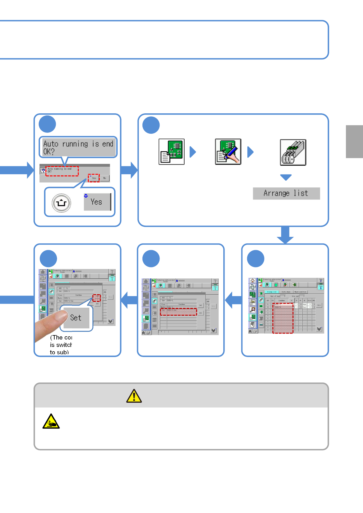 NPM- TT2 EJM1EE-MB-03 O-02 3-3-1 -2 3 4 7 6 5 Confirm the message Display the data edit screen (Data edit) Choose the arrangemen t list from “Feeder/Tray” layer Choose a master component ( → P.4-1-7) Choose a sub compone…