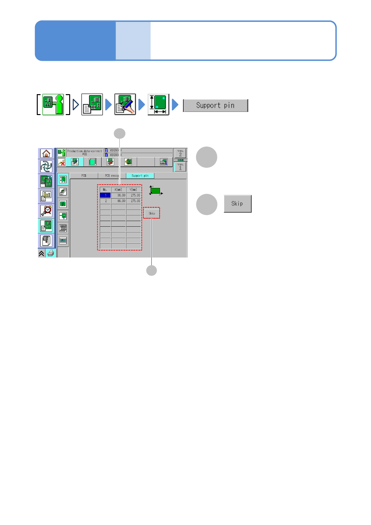 NPM- TT2 EJM1EE-MB -04O-03 Data editing Suppor t pin da ta edit Operating procedure 4-1-5 A A Arrangement coo rdinates (X,Y) of the support pin are displayed. You can edit arrangement coordinates by DGS. B Support pin ar…