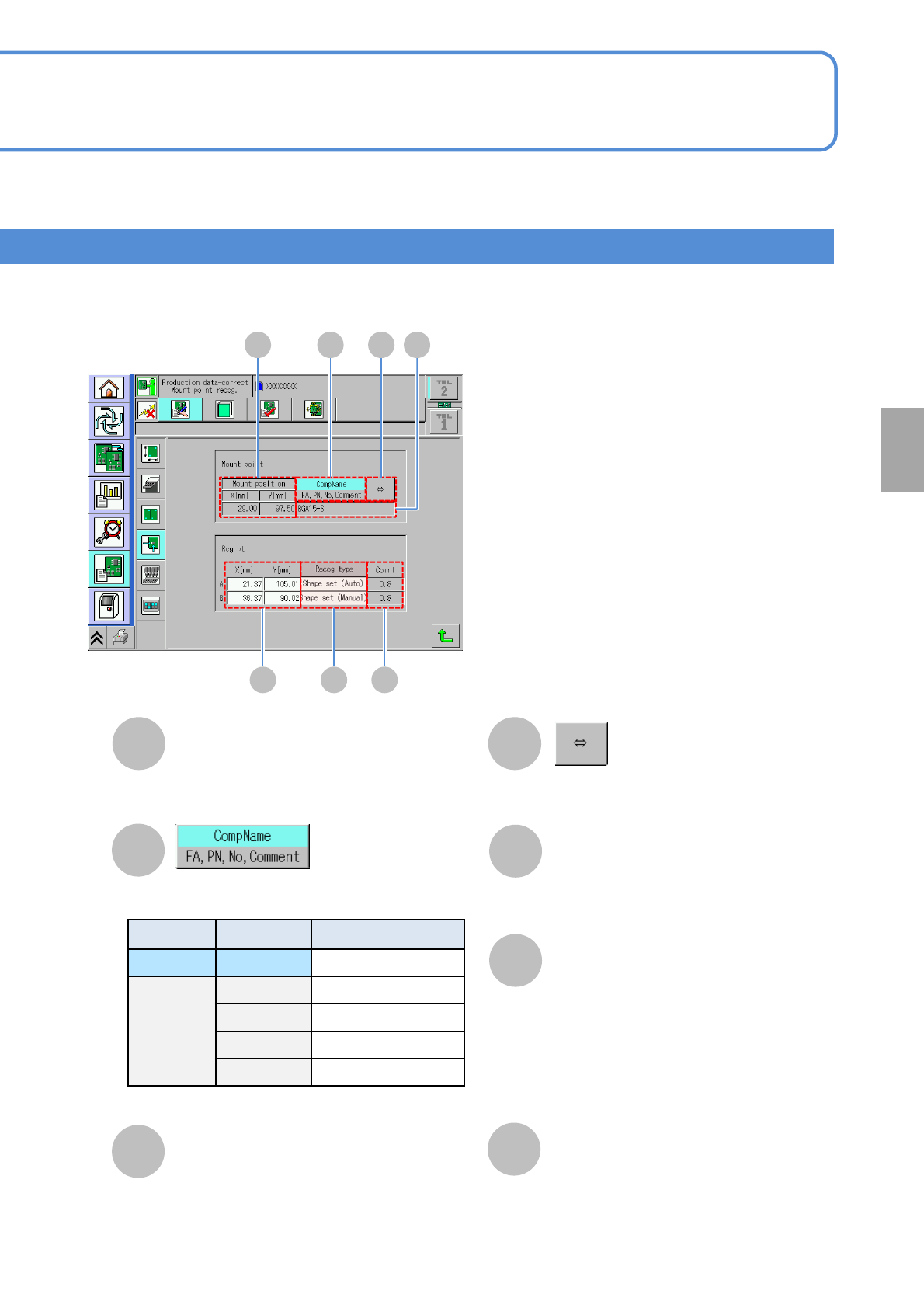 NPM- TT2 EJM1EE-MB-04 O-03 4-1-13 -4 Setting change A Mount position E X[mm]/Y[mm] A B D E F G Recog type F Comment G C B CompName/F A, PN, No, Comment D C Shows the rest of compone nt name if it is too long to show the …