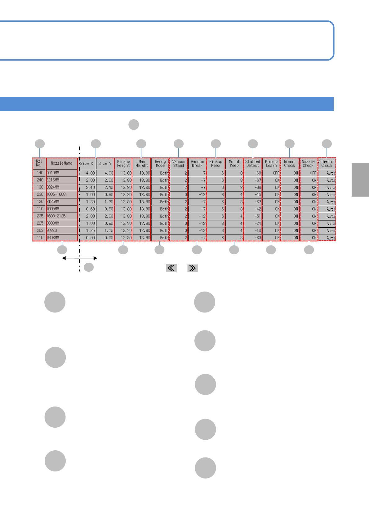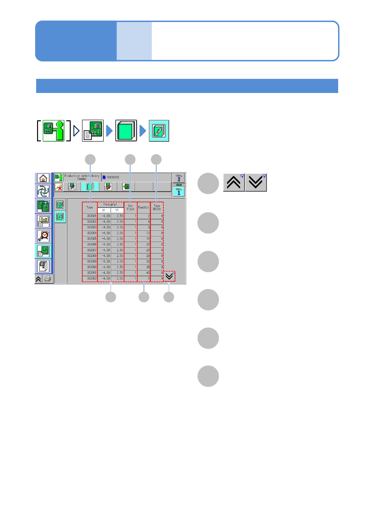NPM- TT2 EJM1EE-MB -04O-03 Data editing Libr ar y c heck 2 B Ty p e PickupCalX/Y C Set Pitch D FeedV ol E Ta p e W i d t h F Feeder library B C D E F A A Shows the previous or next table. Offset of a feed er picku p posi…