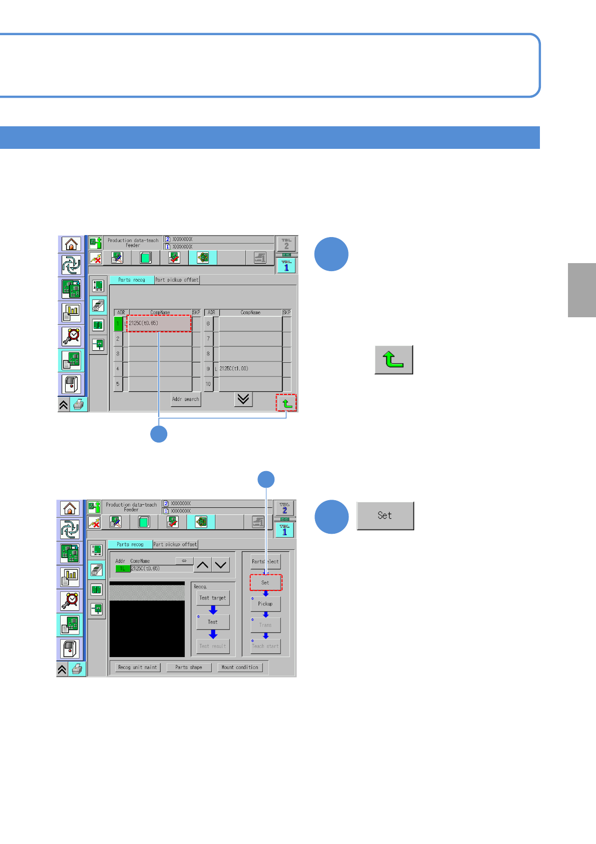 NPM- TT2 EJM1EE-MB-04 O-03 4-2-4 -4 Setting change 3 3 (The setting scre en of pickup condition is displayed) Choose a component to recognize 2 ■ T o cancel 2 ● An item in the “ADR” field shown in green color means a com…