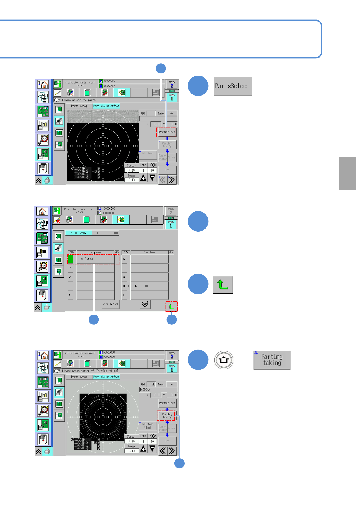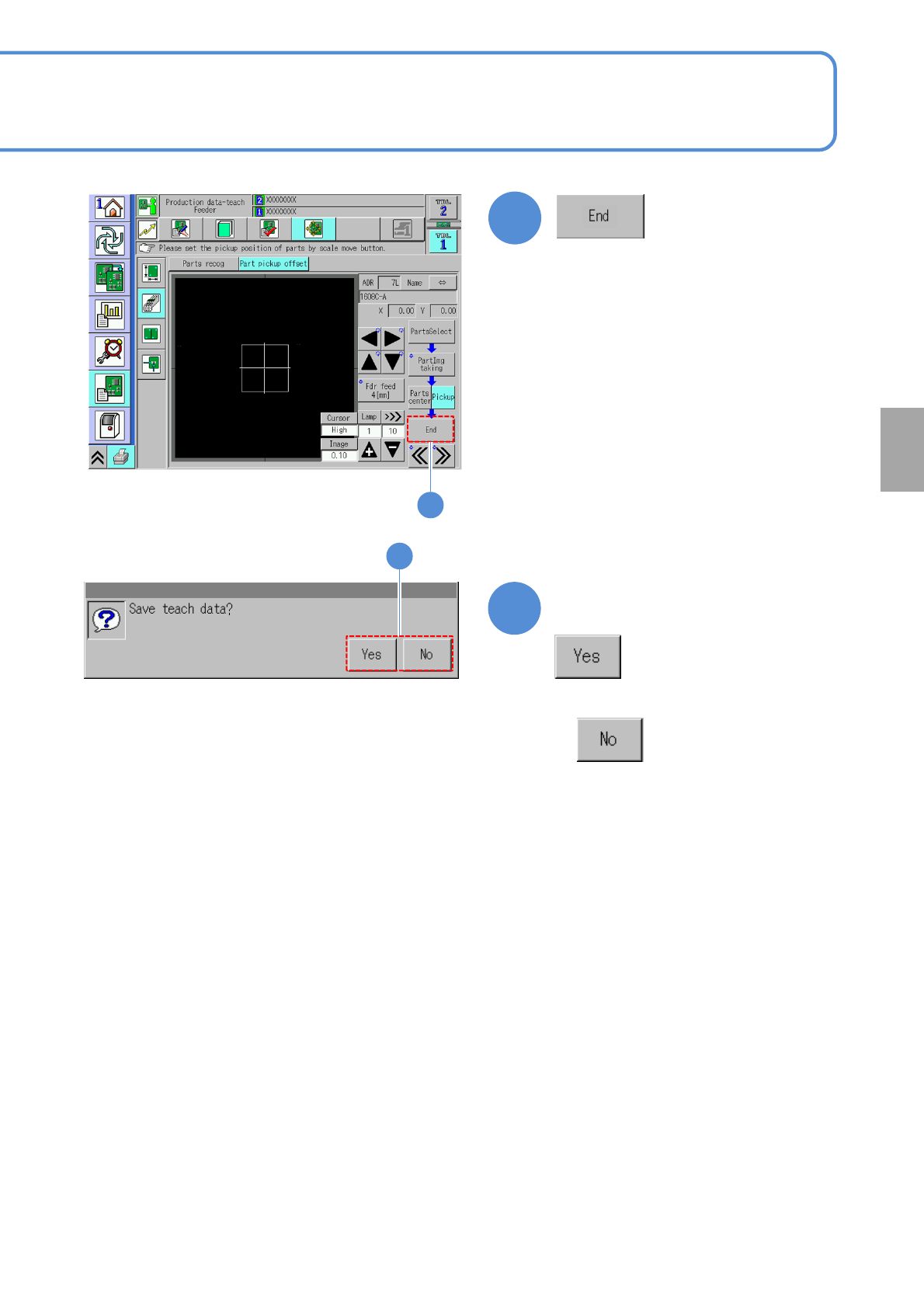 NPM- TT2 EJM1EE-MB-04 O-03 Produc- tion data teaching 4-2-6 -3 Operating procedure 4-2-6 P ar t vacuum of fset teac hing 2 6 6 7 7 5 5 Specify the parts center using inching. Specify the actual pickup position using the …