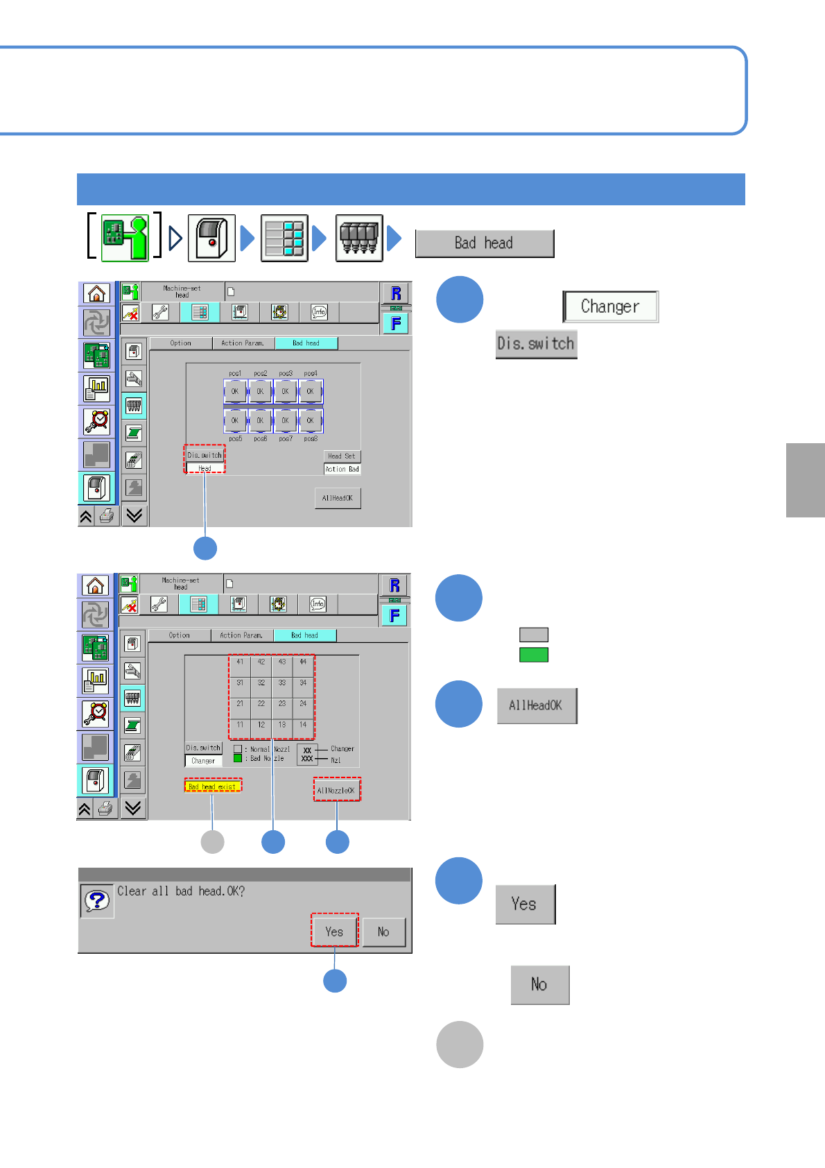NPM- TT2 EJM1E E-MB-05O-05 5-1-6 -2 System administration A For a nozzle changer 1 2 1 Confirm the message 3 4 4 ● (Gray): Normal ● (Green): Defective (All nozzles become [Normal]) 3 Confirm a defective nozzle and replac…