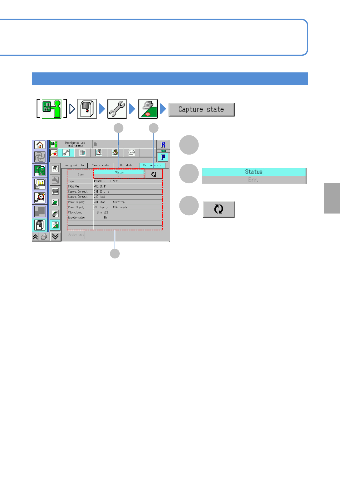 NPM- TT2 EJM1E E-MB-05O-05 5-2-10 -6 System administration Checking capture status Status and error of each item ● Updates to the latest information . Switches the display type. A B C A B C