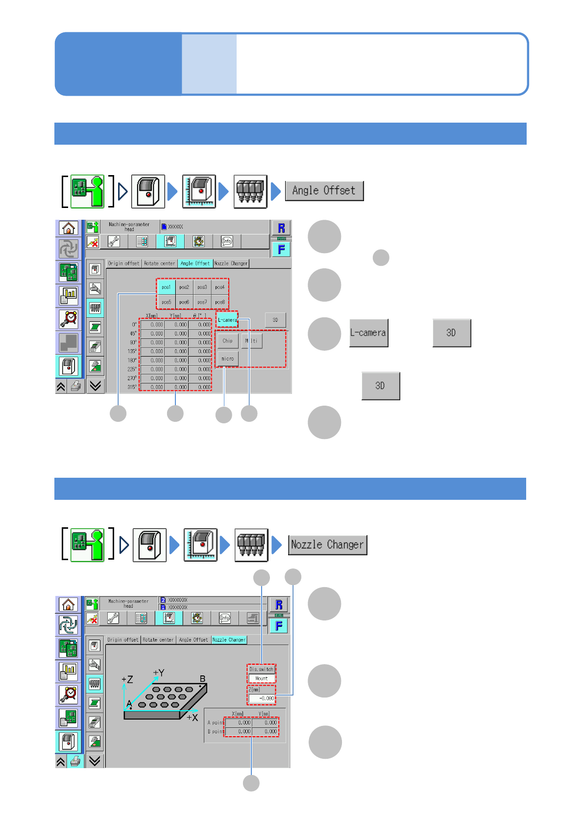 NPM- TT2 EJM1E E-MB-05O-05 Nozzle position Offset of the selected nozzle is displayed in . 5-3-6 Machine parame- ter C B 設備に設置されている フィーダー の メモリー 情報 を 表示します 。 Checking offset per head angle You can check the X/Y/ θ elemen…