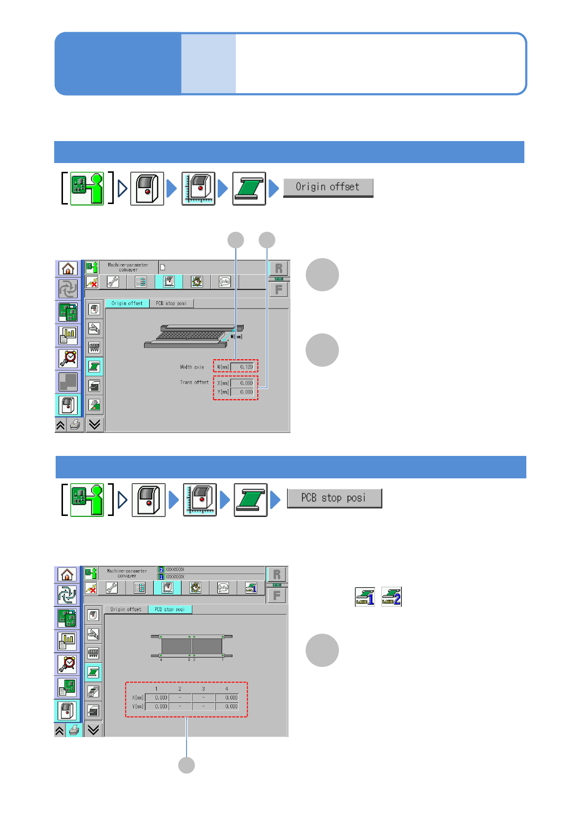 You can check conveyor origin offset (calibration result) and PCB stop position offset.