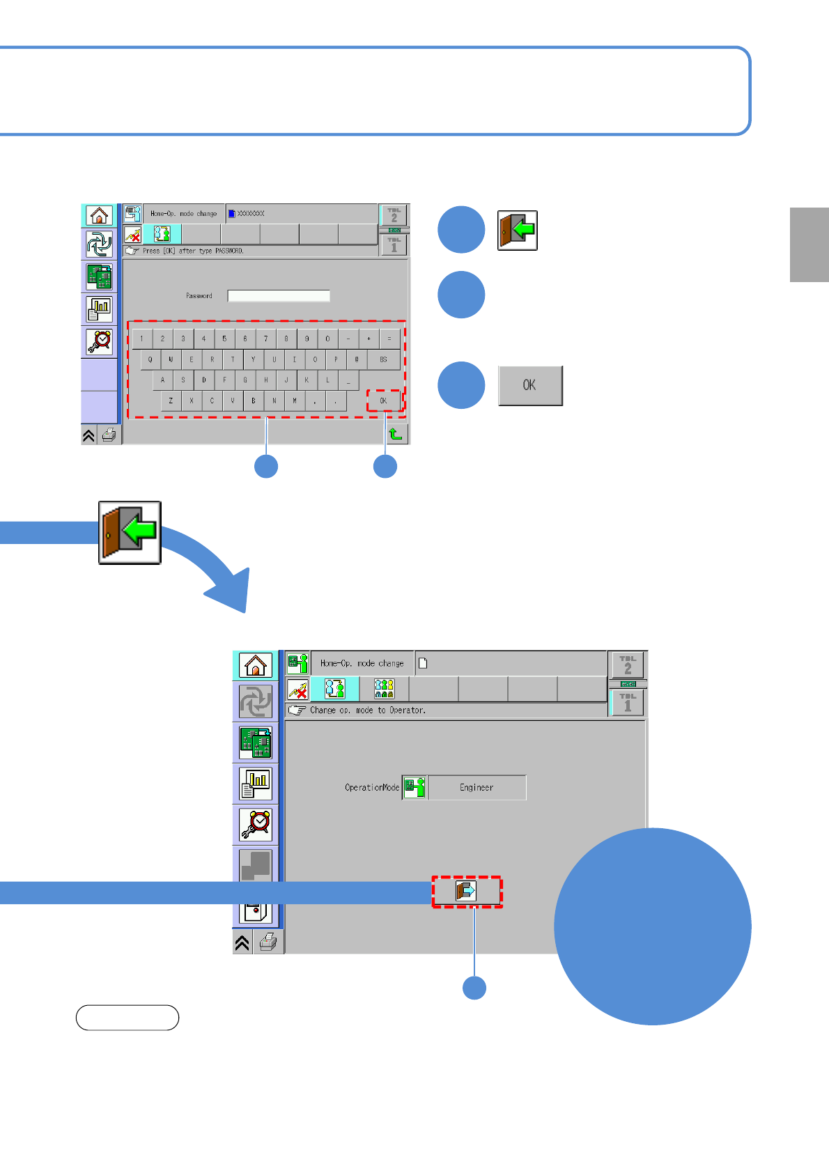 NPM- TT2 EJM1EE-MB -02O-04 2-1-2 -1 Basic opera- tion Mode selection Operating procedure 2-1-2 ■ Operator mode scr een ■ T o switc h to Oper ator mode 1 Oper ator mode