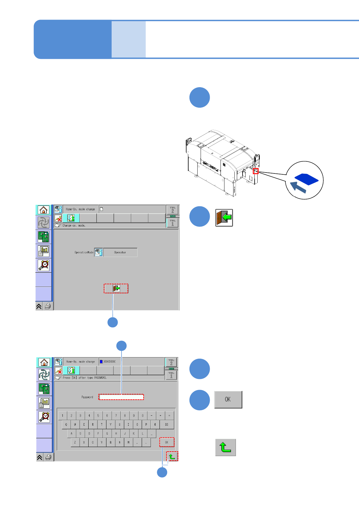NPM- TT2 EJM1EE-MB-02 O-04 Operating procedure 2-1-3 Select an ope ration mode on the defa ult screen displayed when the machine is started up. Insert a key disk ● Insert the SD card (the attached key disk) to change the…