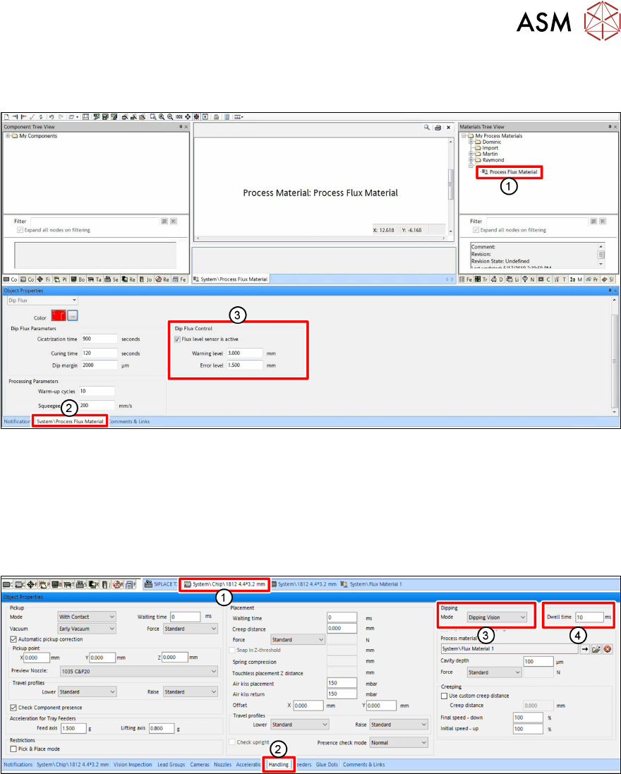 ► In SIPLACE Pro, select the flux material (1) from the Materials Tree View.