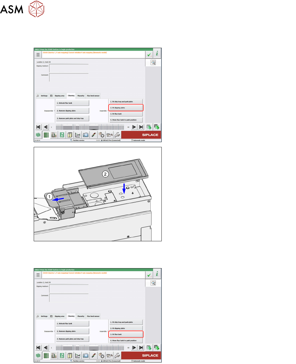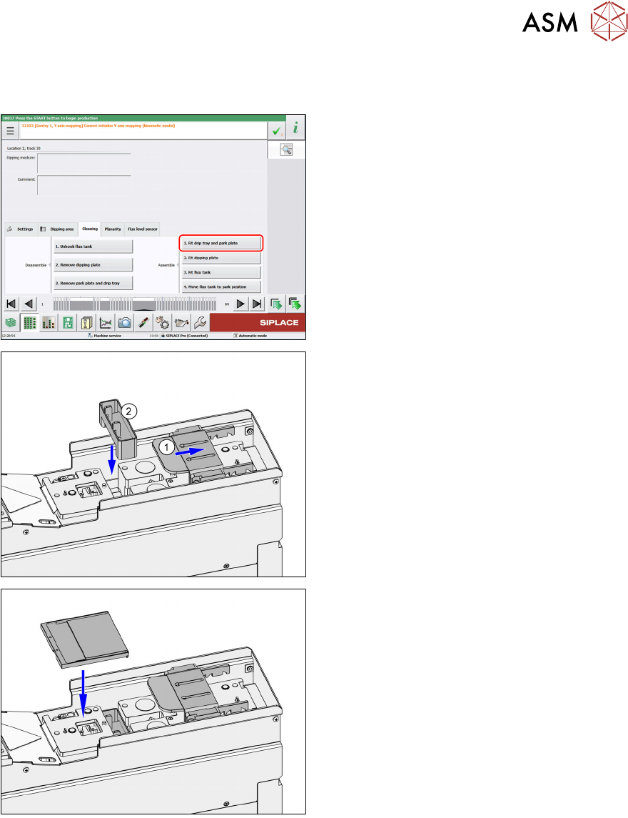 4 Operation 4.12 Fitting 74 User Manual SIPLACE Linear Dipping Unit 2 X 05/2020 Fitting the dipping plate Prerequisites: The drip tray and the park plate are fitted. The dipping plate is not yet fitted. ► Click on the Fi…