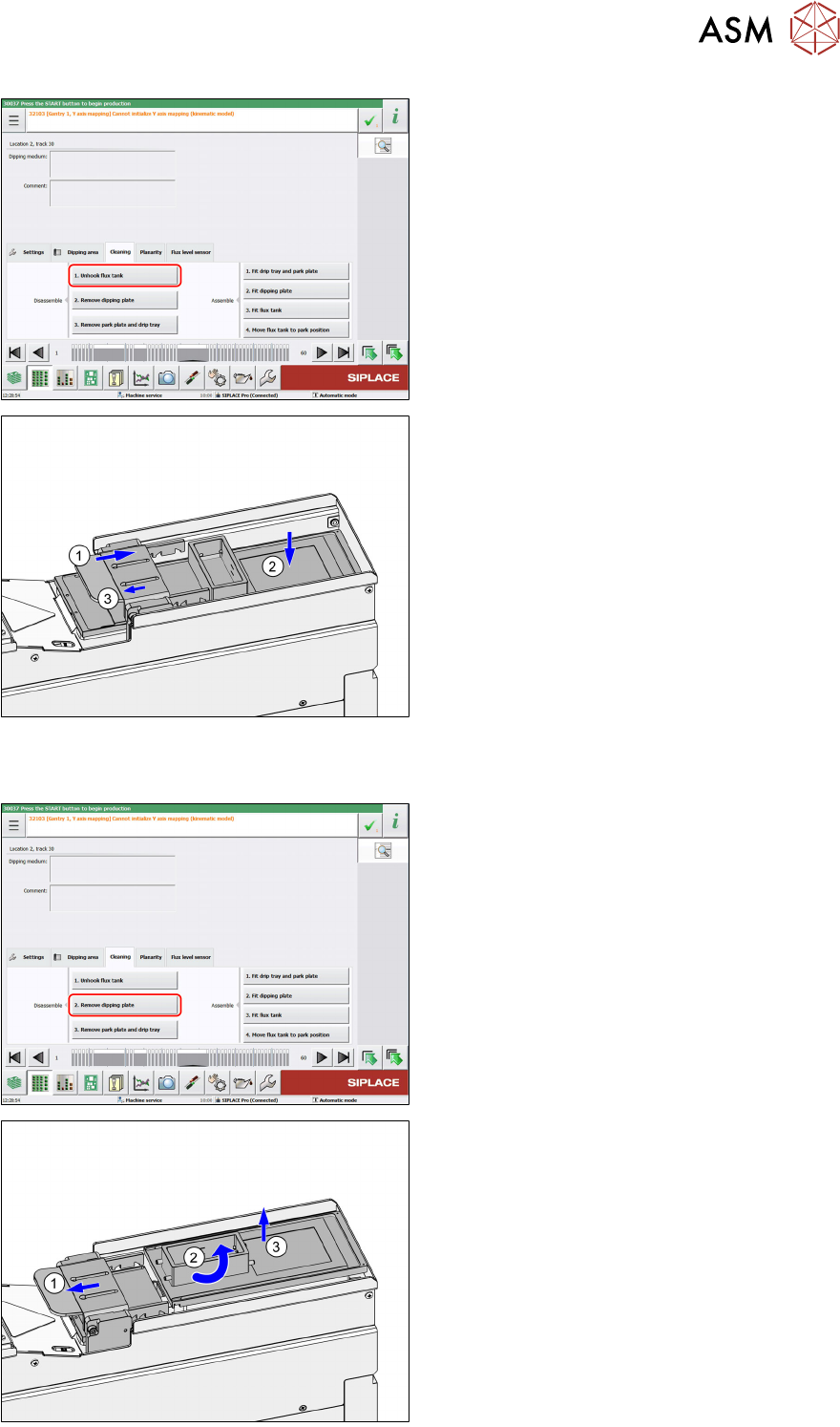 5 Cleaning 5.2 Removing the parts to be cleaned 82 User Manual SIPLACE Linear Dipping Unit 2 X 05/2020 5.2 Removing the parts to be cleaned NOTICE Observe the exact order It is important to perform the steps for removal …
