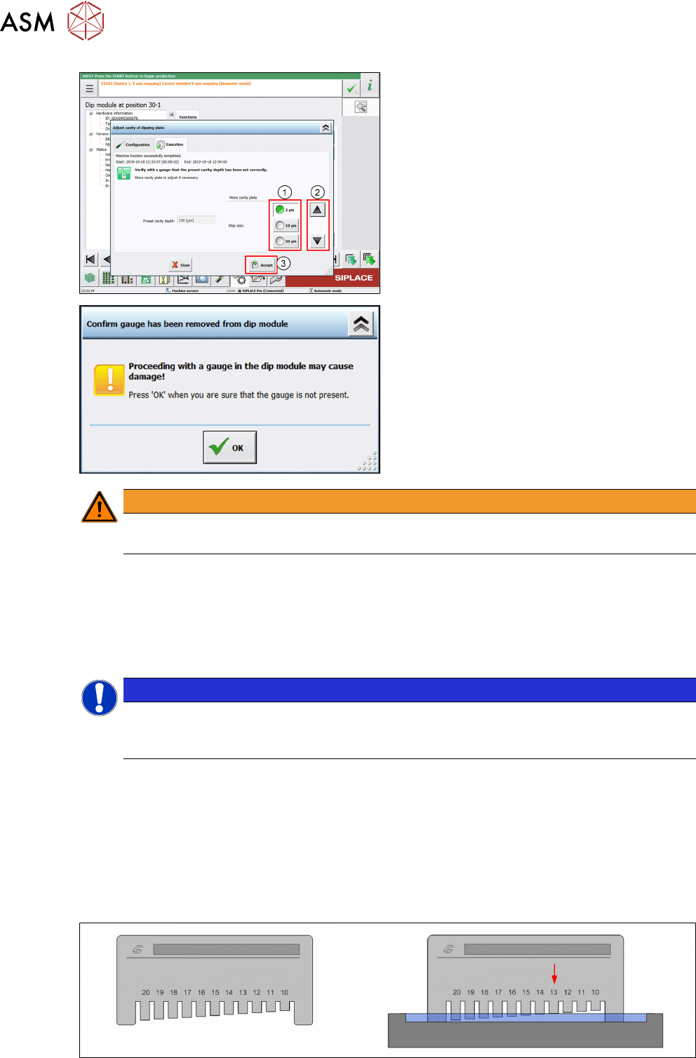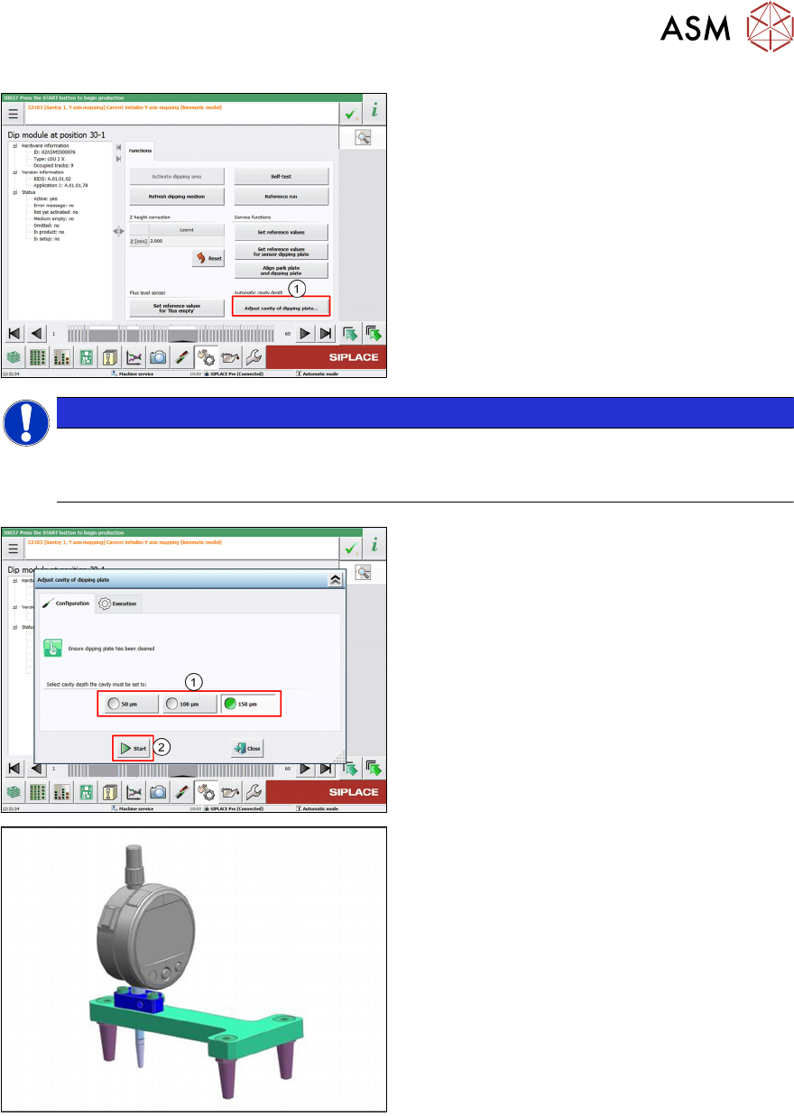 4 Operation 4.4 Adjust cavity depth User Manual SIPLACE Linear Dipping Unit 2 X 05/2020 61 ► Click on the Adjust cavity of dipping plate… button (1) . NOTICE Notice The Adjust cavity of dipping plate… button is only disp…