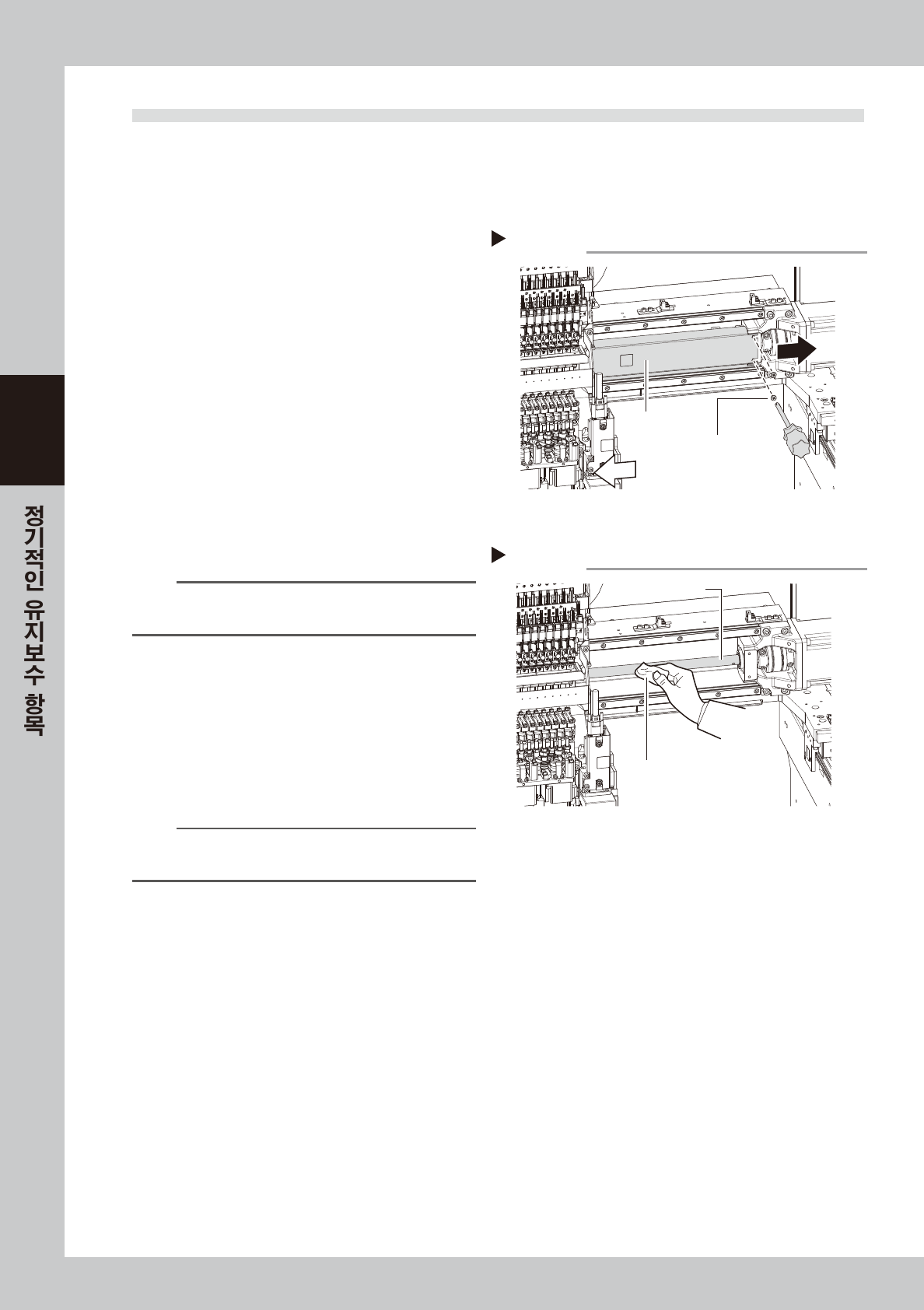 3-15 3 4 구리스 를 주입합니 다 . 1 . 우측그 림과 같이 구리 스 니 플이 보 이 도 록 헤드 유닛 을 한 쪽 으로 이 동시 킵니 다 . 2. 3 군데의 구리 스 니플 중 , 가운데가 볼스크 류 의 니 플입 니다 . 구리 스 건 ( 표 준타입 ) 을 사 용 해서 구리 스 니플 로 부터 지정 구리 스를 주입 해 주 십시오 . n 요점 새 로 운 구리 스가 틈 새 로 부 터 스 며 나…