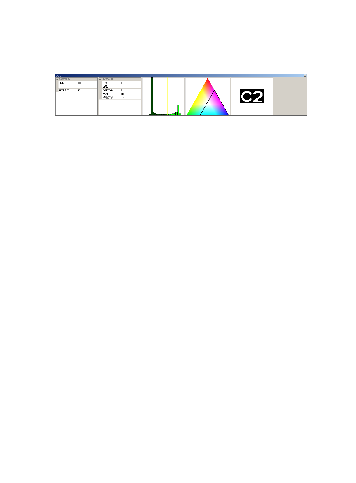 OCR 计算参数: 亮度参数(可用鼠标 通过直方图来设定) : a) 亮度上限( High ) :设定最高亮度值( 0~255 ) b) 亮度下限( Low ) :设定最低亮度值( 0~255 ) 颜色参数(可用鼠标 通过色彩图来设定) : c) 红色上限:设定红色 最大值( 0~173 ) d) 红色下限:设定红色 最小值( 0 ~173 ) e) 绿色上限:设定绿色 最大值( 0~173 ) f) 绿色下限:设定绿色 最小值( 0~…