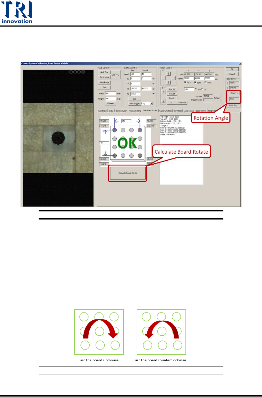 5) From the value, users will know whether to turn the calibration board clockwise or