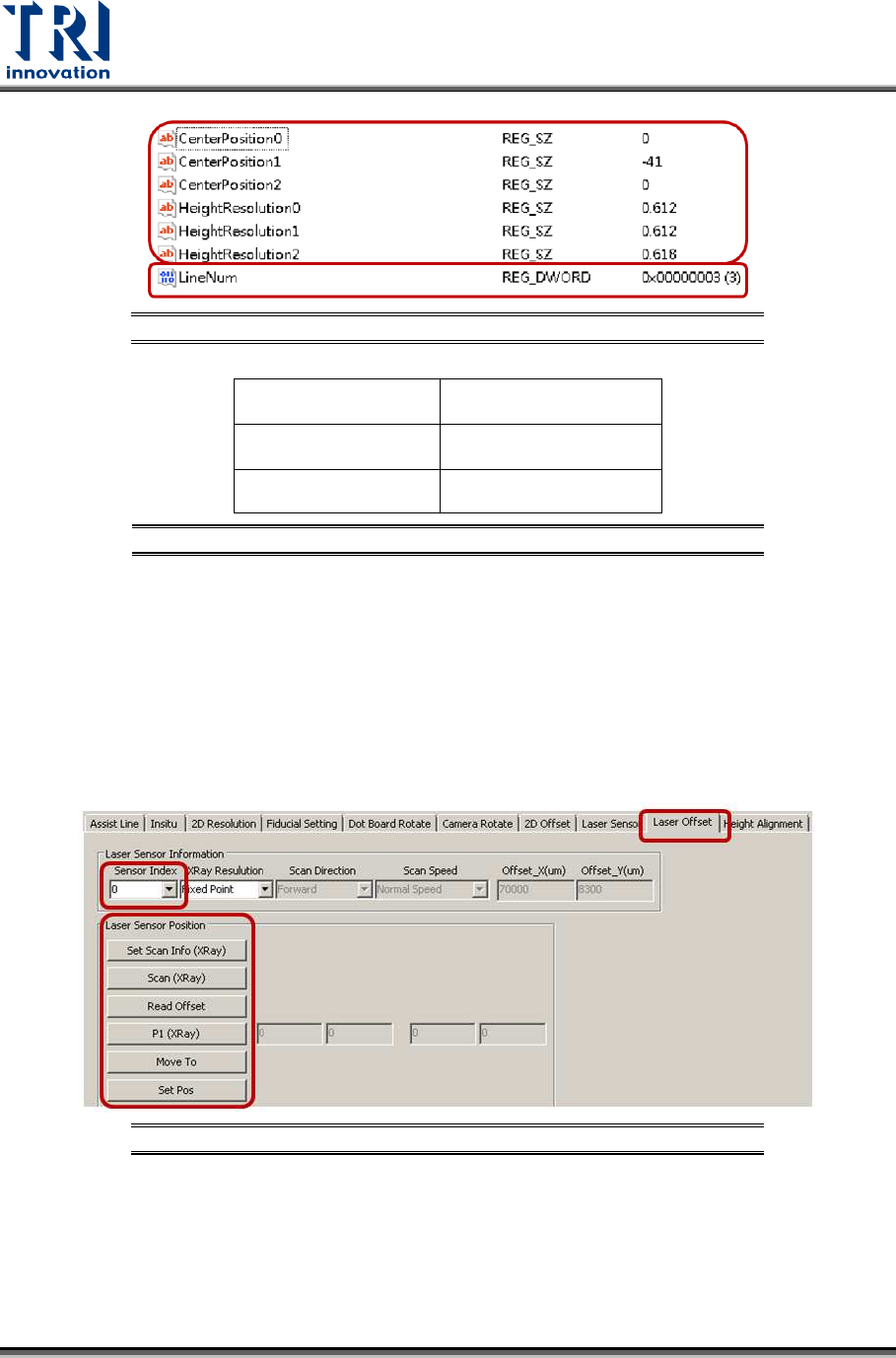 Test Research, Inc. 66 TR7600 SI II Series User Guide – Camera Ca libration Figure 126: Registries Laser Sen sor0 Center Posi tion0 Height Res olution0 Laser Sen sor1 Center Posi tion1 Height Res olution1 Laser Sen sor2 …