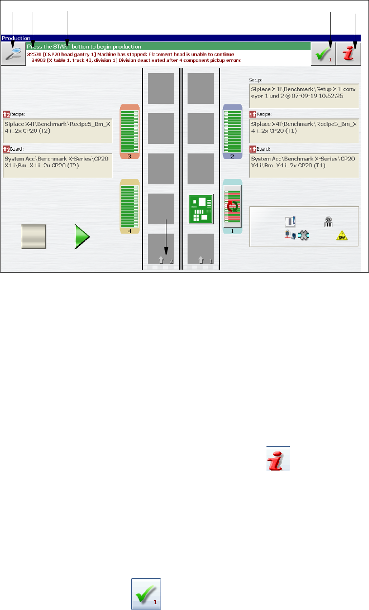 Rys. 5.6 - 1 Widok "Produkcja" z komunikatem alarmowym (na przykładzie SIPLACEX4i)