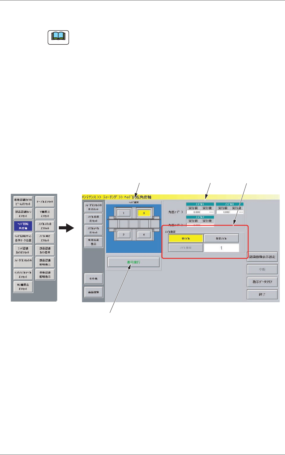 18 8 . 1 ヘッド 回転角度軸 0709 - 001 [2] “ノズル回転角度軸”表示部 多機能ノズルを設置したノズル (1 ~ 3 ) について、基板位置 決め座標系とカメラ座標系との角度 Z( ° ) のオフセットデータが 表示されます。 実行前 :ティーチング前のオフセット値です。 実行後 :ティーチングを行った結果です。 [3] [ ノズル指定 ] ボタン、ノズル表示部 ティーチングを行うノズルを指定します。 [ ノズル指…