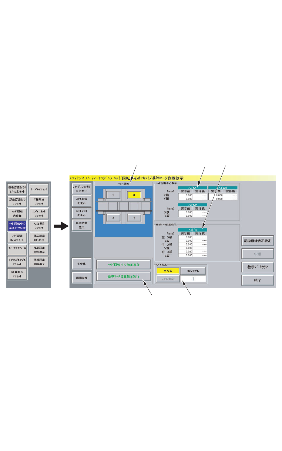 Fig.7-2 “ヘッド回転中心オフセット / 基準マーク位置教示”画面