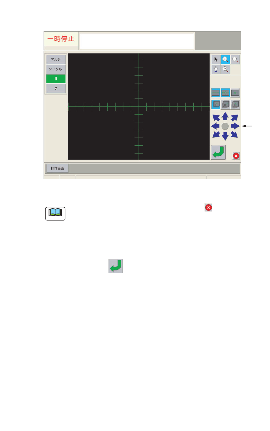 26 0709 - 001 8 . 3 ノズルストッカオフセット (2) [目合せ実行] ボタンを押すと、認識画面が表示され、目 合せ操作が実行できるようになります。 Fig.7-6 認識画面 ノート 目合せ対象がカメラに写らない場合は、認識画面の ボタンを 押して“目合せ操作案内”画面に戻り、ビーム移動を行います。 (3) 目合せ対象の治具マークがクロスラインの中心に位置する ように、認識画面の画像移動ボタンで移動します。 (4) 認…