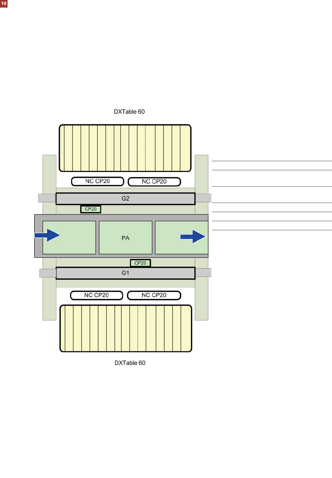 DXT able 60 DX 料台带 60 个料位。 CP20 SpeedStar 贴装头。 其他可能的贴装头配置。 NC 与贴装头配置相符的 吸嘴交换器。 G1 悬臂 1 G2 悬臂 2 PA 贴装区 机器理念 以 SIPLACE DX2 为例 请注意:有关所有可能的贴装头配置,请参 考从 12 页开始的机器性能一章。