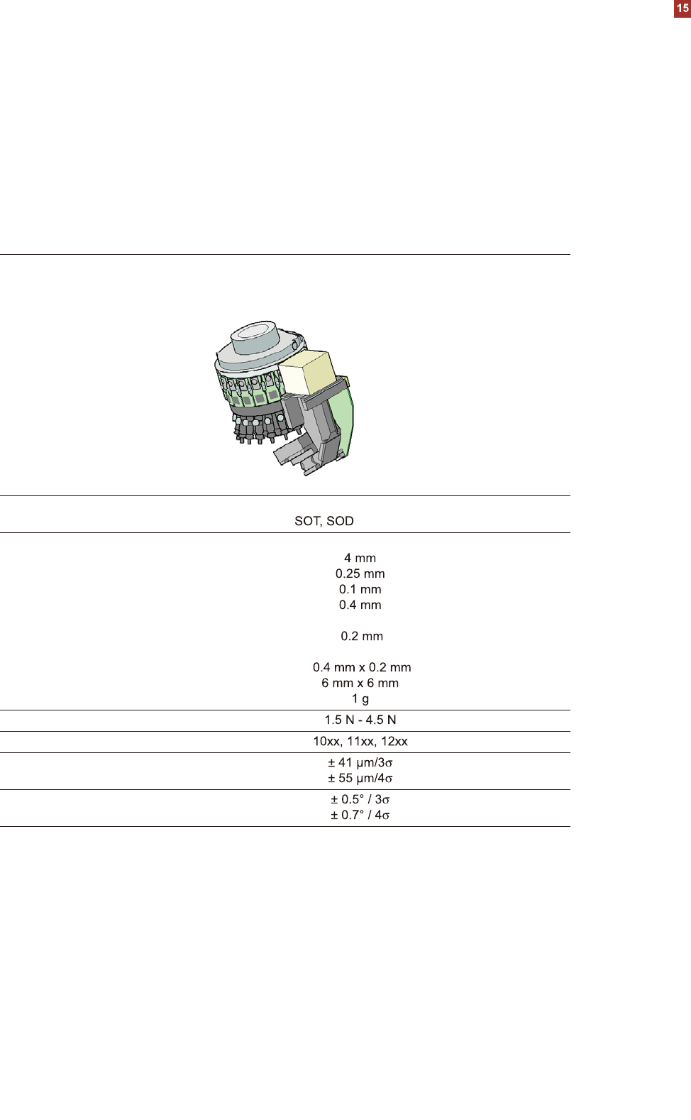 元件范围 a 元件规格 最大高度 最小引脚间距 最小引脚宽度 最小焊球间距 最小焊球直径 最小尺寸 最大尺寸 最大重量 可编程贴装压力 吸嘴类型 X/Y 轴精度 c 角精度 元件覆盖范围 元件照相机类型 照明度等级 可以设置的照明度等级 SIPLACE 贴装头 SIPLACE 12 吸嘴贴装头 (C&P12) 12 吸嘴贴装头 元件照相机类型 30 12 吸嘴贴装头 元件照相机类型 28 0402 至 PLCC44 、 BGA …