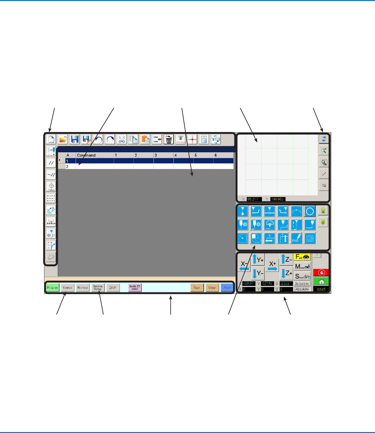 本节提供了对所有DispenseMotion软件屏幕、窗口及图标的一个概览。该信息仅供参考。如需设置系统并创建点胶程