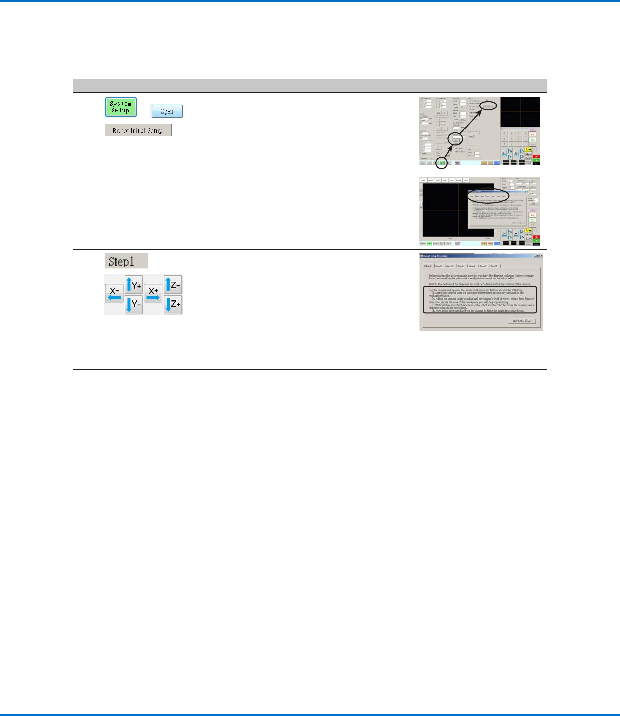 EV系列自动点胶系统 www.nordsonefd.com/cn china@nordsonefd.com +86 (21) 3866 9006 诺信 EFD 在全球范围内销售专业点胶系统并提供技术支持服务 43 使用机械手初始设置向导设置系统 使用机械手初始设置向导设置系统 机械手初始启动向导将引导您完成正确设置系统所需的所有步骤,包括偏移的校准和设置。 机械手初始设置(“步骤 1”选项卡): 打开机械手初始设置向导并对摄像头进行聚焦…