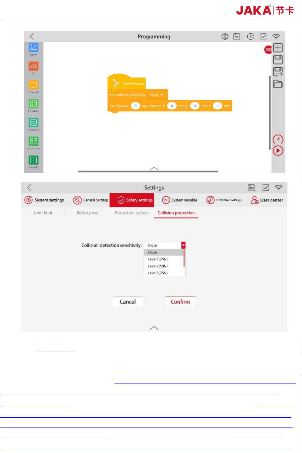 JAKA Zu Sp 7 detection. The higher the level, the less sensitive the detection collision is. When executing the program, if the payload need to be changed, the collision should be closed in advance in ord er t o reset th…