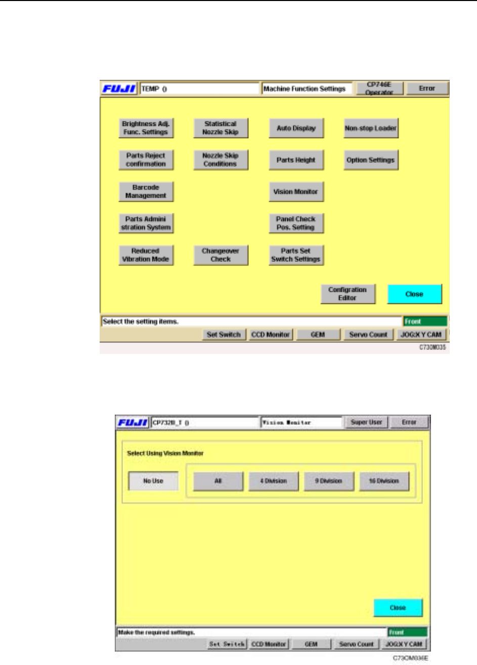 Machine System >> Basic Operation 4-42 SYS-CP842-1.0E Camera Monitor Settings 1 Select [Maintenance] [Confi guration] [V ision Monitor] from the [Main] screen. 2 Select from [All], [4 Division], [9 Divisi on] or [1…