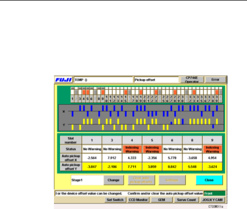 Under each slot number, the slot warning status and X and Y auto pick up offset