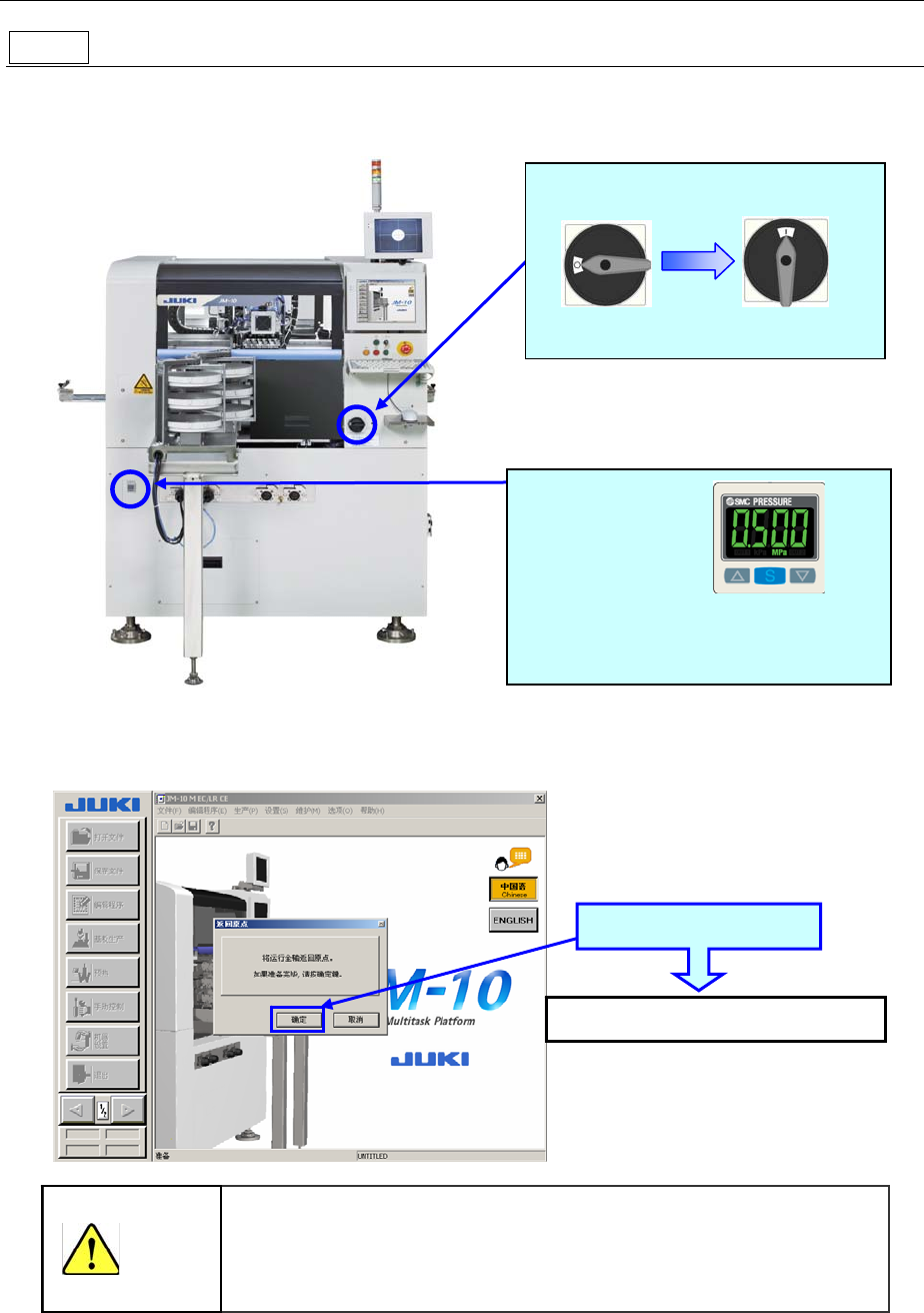 操作手册 2-2 2-2 操作概要 步骤 1 接通主机电源 ① 确认装置内部没有基板和工具等。 ② 确认压力表后,向右扭转主开关。 ③ Windows XP 和主机的程序依次起动后,会显示下列画面信息。 选择「确定」 ,则开始返回原点。 执行返回原点时装置即开始运行。尽管在盖子 打开的状态下装置不会运 行,但为避免受伤,请绝对不要把手和头部伸进装置内部。 此外,请在确认装置内没有扳子等会磕碰贴片 头等物体后,再执行返回 原点。 请选择「…