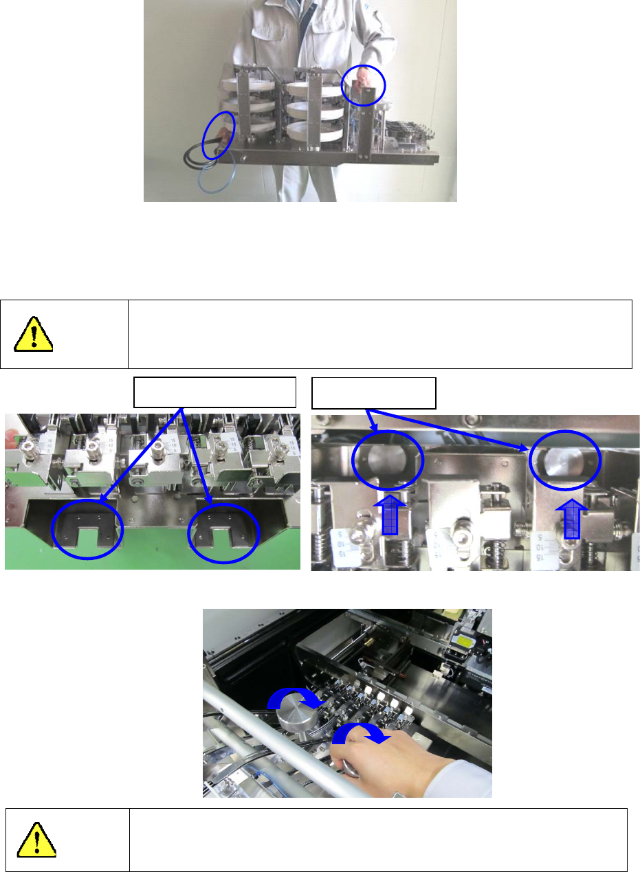 操作手册 2-16 2)拿起圆型供料器。 将线缆及气管整理好,抓住手把和把持部位。 3)安装到供料器台架上。 请将前端的主底盘缺口部位,插入位于台架左侧的圆型供料器安装台的铰链螺丝部位( A 部 位) 。 注意 如果要在主机上安装 2 台圆型供料器,请将 第 1 台安装在右 侧、将第 2 台安 装在左侧 。如果顺序错误,则无法 将圆型供料器安装到主机上。强行安装 , 圆型供料器可能会被损坏,请务必按步骤进行操作。 4) 固定圆型供料器。…