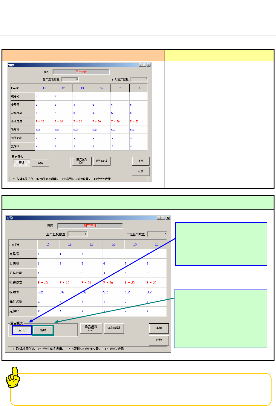 4-1 用完元件(在操作选项中选中“无元件暂停”时)