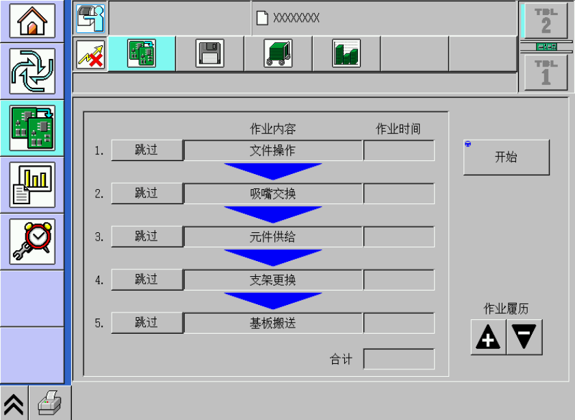 2 ,连续准备作业 本画面将生产开始前的多项准备作业视为一项整体作业, 它会自动向下一步必要的画面转换,从而使各项 准备作业进行得顺畅容易。 另外,它还会将各项准备作业的所耗时间作为作业履历加 以记录以备日后查询。