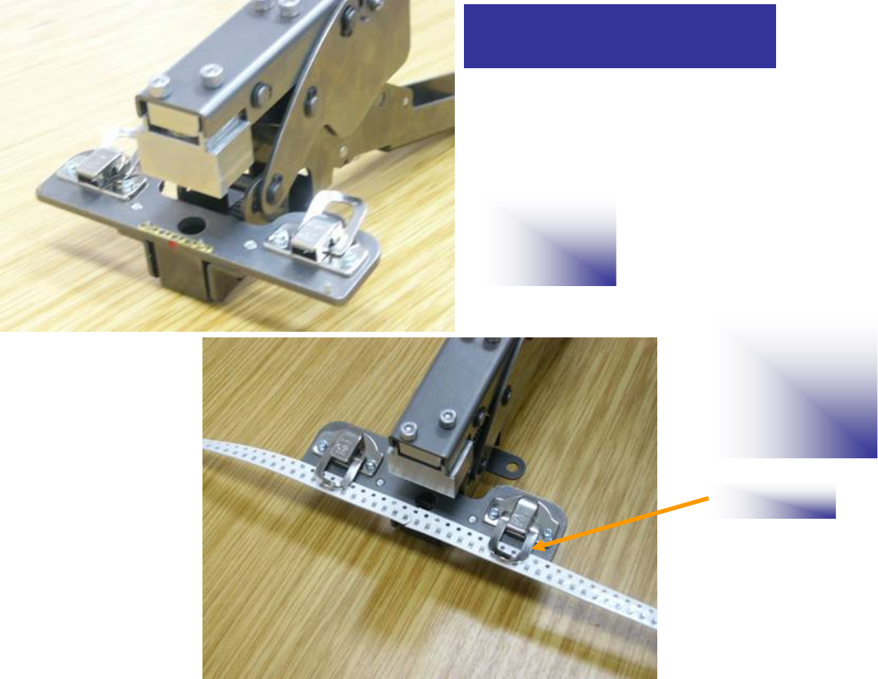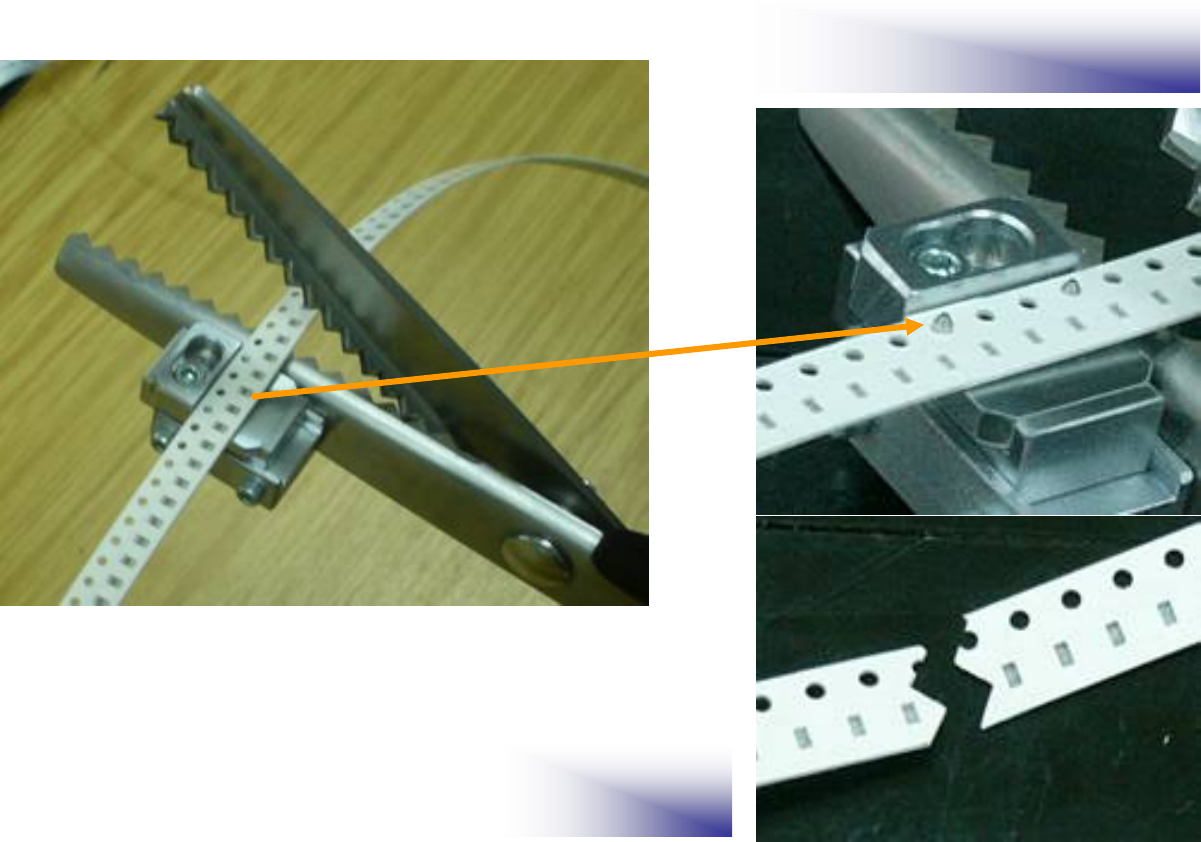 将编带放置在剪刀上,并将 孔对准剪刀上的定位销。 剪成后的两段 编带端面。 1,纸编带(Paper,8mm)的连接。