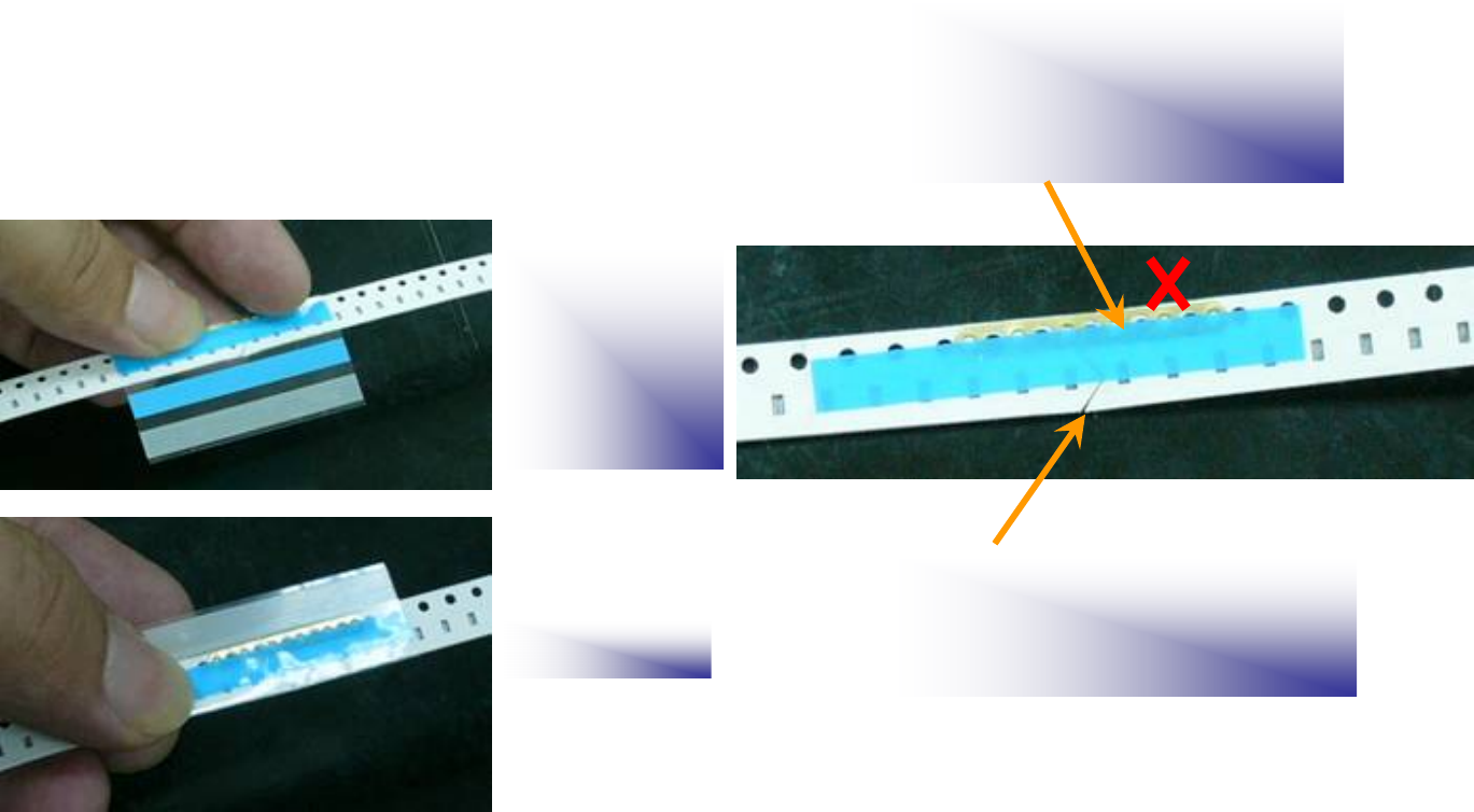 2,塑编带(Emboss,8mm)的连接。 剪塑料编带时,使用普通 的平剪刀。 从剪编带时的反面来看,一般剪编带时是 从两个料仓中间剪下去的。