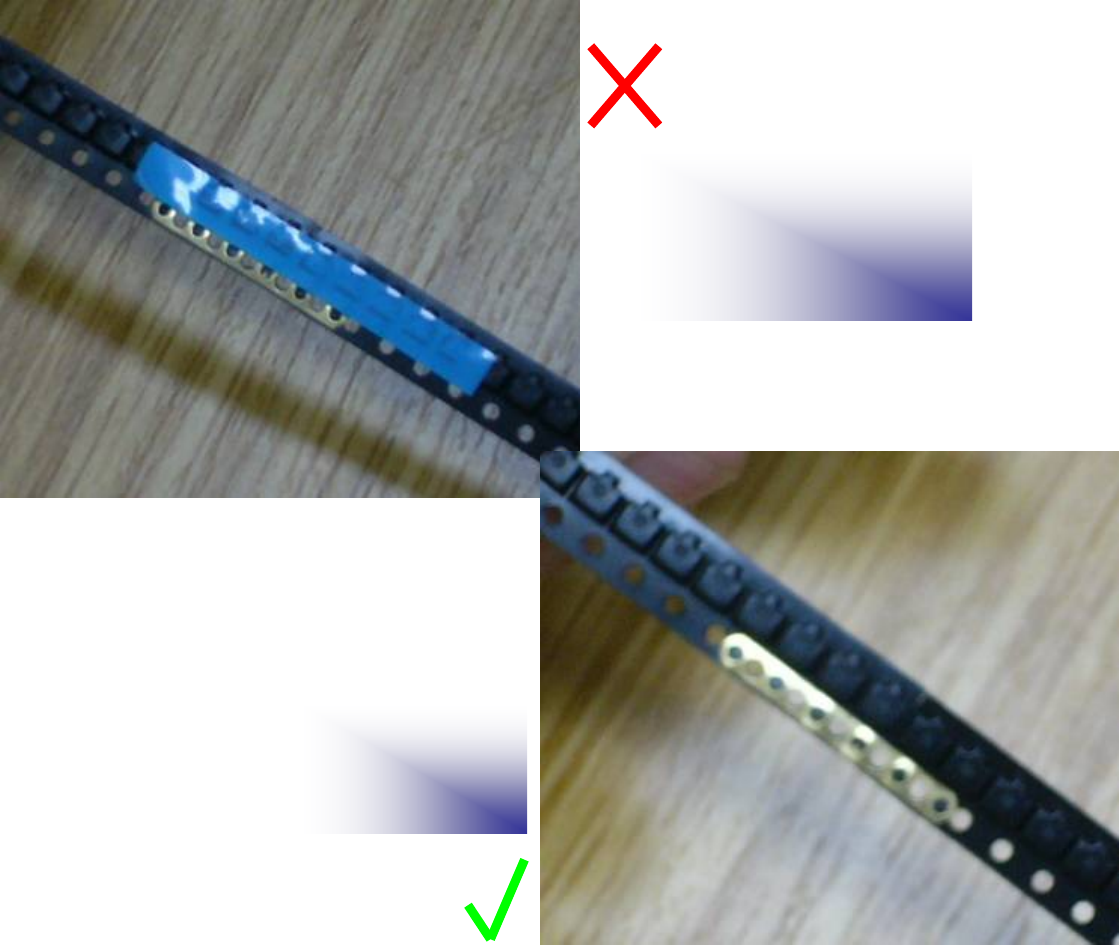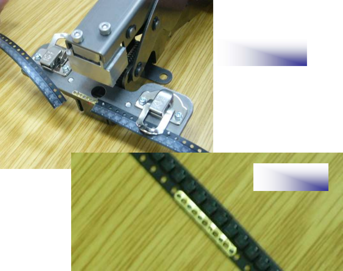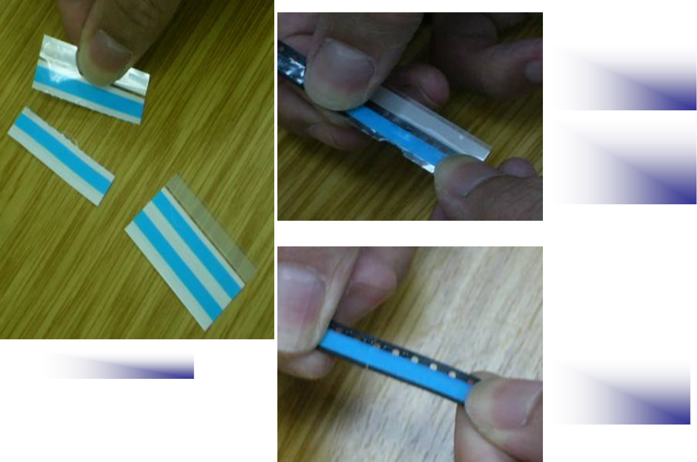 由于塑料编带只需 贴正面,故粘带也 只使用一半。 撕去粘带的左半边。 按照正确位置将粘 带贴到塑料编带的 正面,注意对准覆 盖膜。 剥去废塑料纸后 用手使粘带更贴 和些。