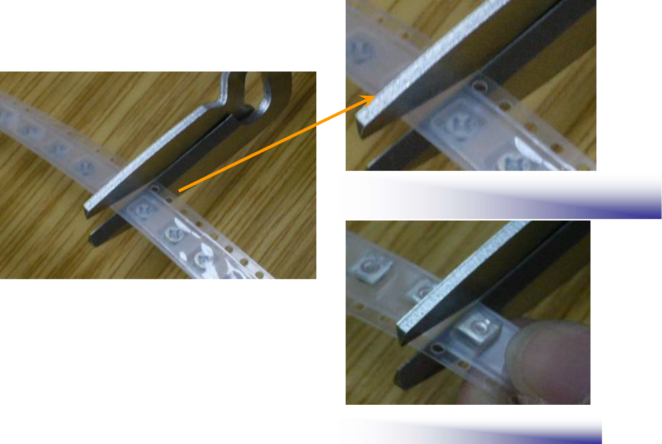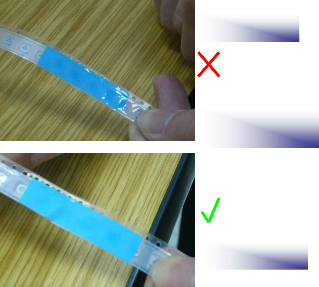 3,塑编带(Emboss,12mm以上)的连接。 12mm宽度以上的编带料仓间距较大,故剪 的时候只要对准粮仓间的输送孔中心即可。 反面观察剪断的位置。