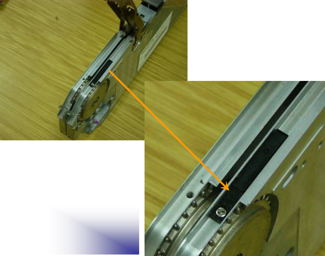 2.实际设定垫片的状态。 《1》. CM402 料架垫片只用在8mm的料架上, 有五种垫片: 纸带专用 垫片, 扁宽胶带用垫片, 扁窄胶带用垫片, 白色胶带用磁性垫片, 蓝 色胶带用磁性垫片. 《2》. 纸带专用垫片使用方法是:底下小钉朝齿轮 ( 如图二 ). 《3》. 扁宽胶带用垫片使用方法是:螺丝孔朝朝齿轮 ( 如图三) . 《4》. 扁窄胶带用垫片是用在8mm的大卷料带,使用方法是螺丝孔朝齿 轮 ( 如图四 ). 《5》. 蓝色胶…